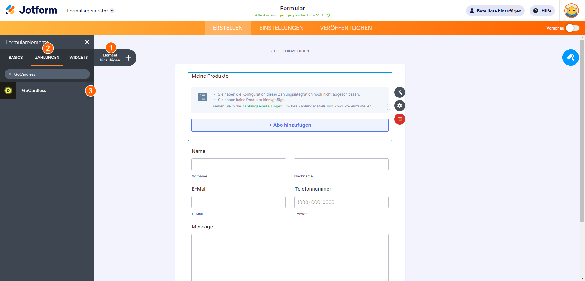 Erstellen Sie ein neues Formular oder bearbeiten Sie ein bestehendes und folgen Sie den folgenden Schritten, um GoCardless in Ihr Formular zu integrieren.