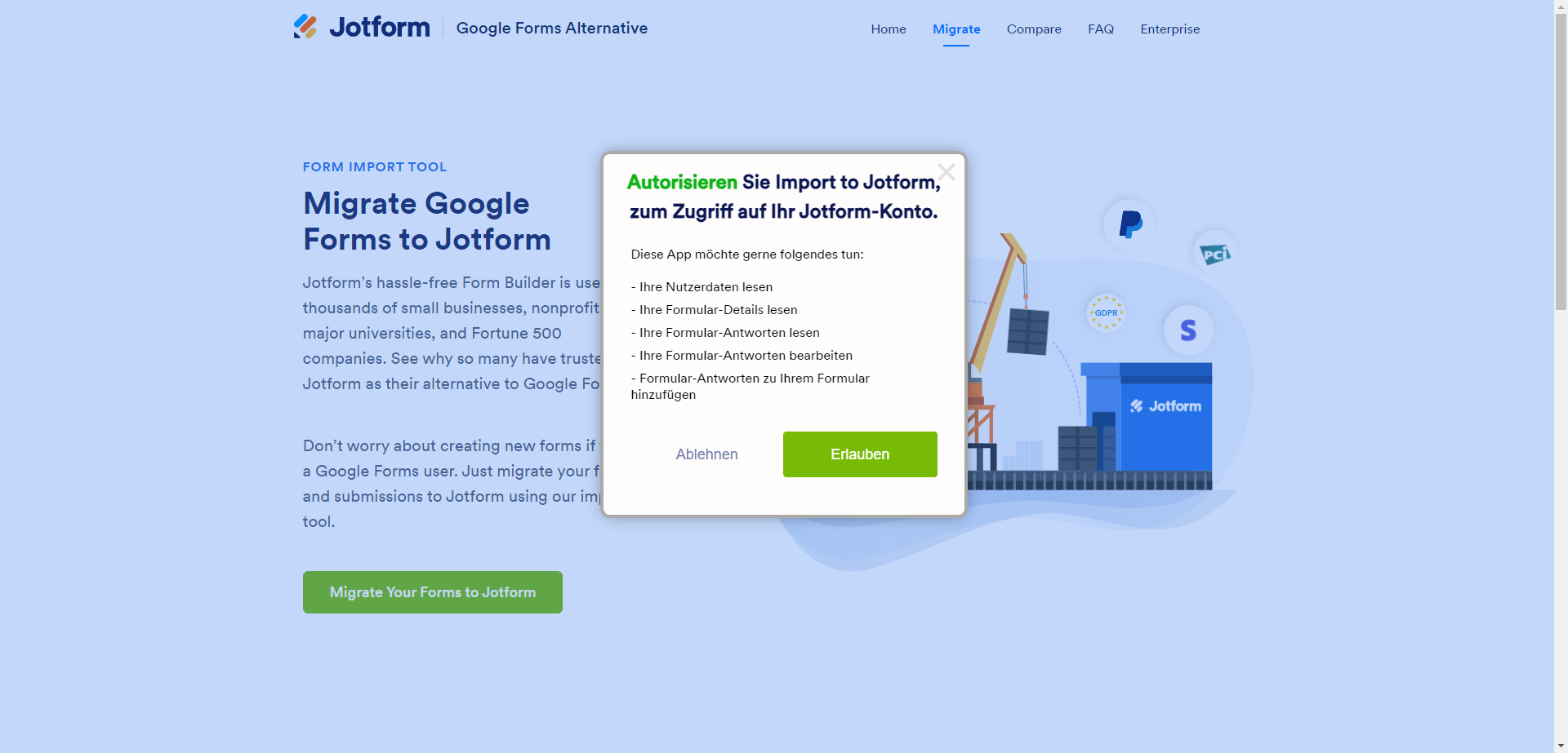 - Klicken Sie auf den Migrieren Sie Ihre Formulare zu Jotform Button.