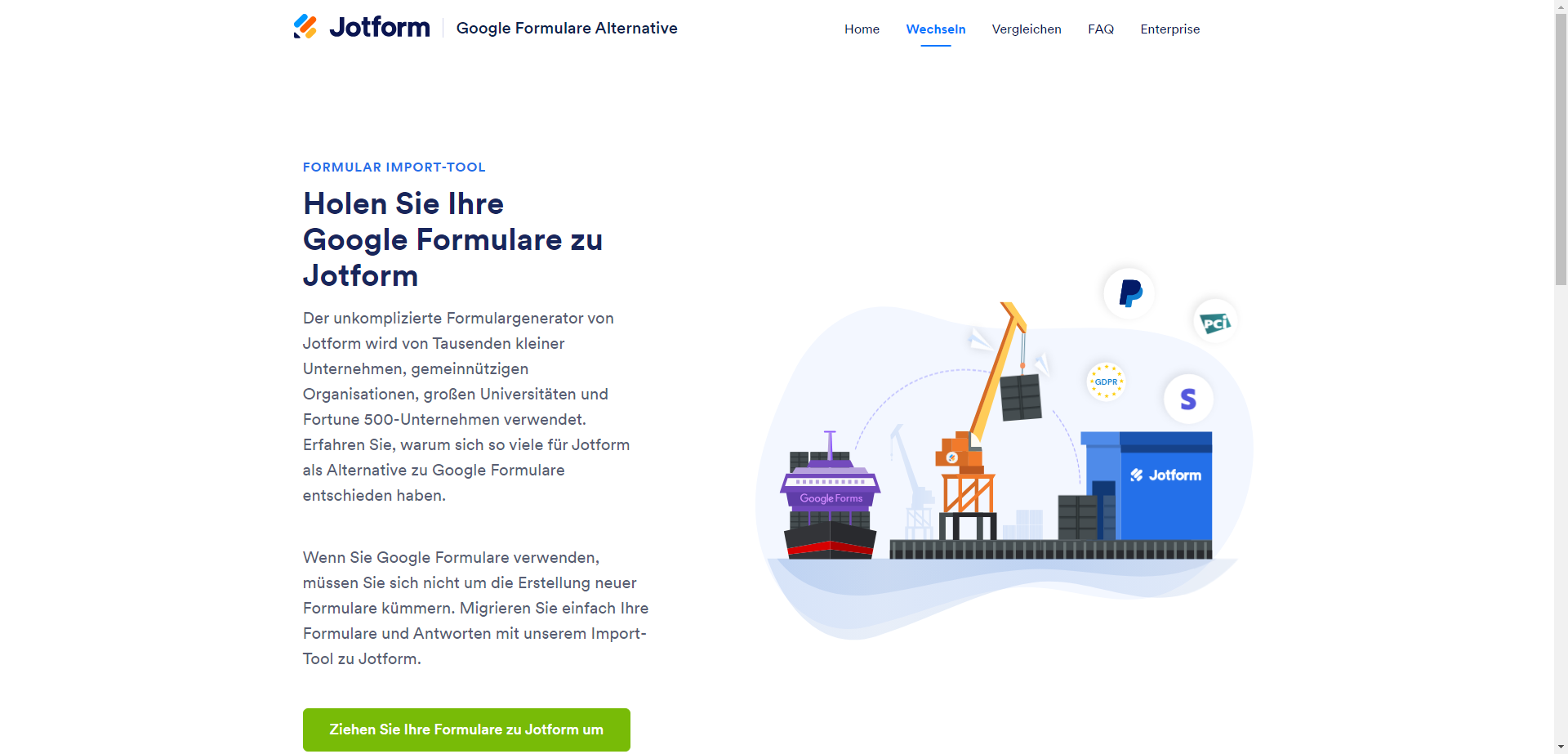 Mit dem Google Formulare Import-Tool von Jotform können Sie Ihre vorhandenen Google Formulare in leistungsfähigere Formulare umwandeln, die durch den fortschrittlichen Formular-Generator unterstützt werden. Verbessern Sie Ihre Formulare mit dem benutzerfreundlichen Formulardesigner und verbinden Sie sie über Integrationen mit weiteren Anwendungen und Zahlungen.