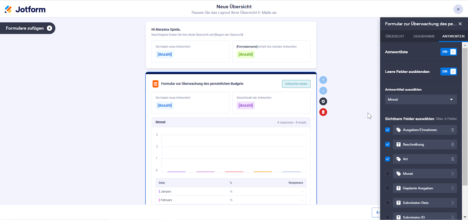 Sie können personalisieren, was Sie von Ihren Formularantworten sehen möchten. Sie können wählen, welche Felder im Digest sichtbar sind, und Sie können leere Felder und die Liste der Formularantworten ausblenden.