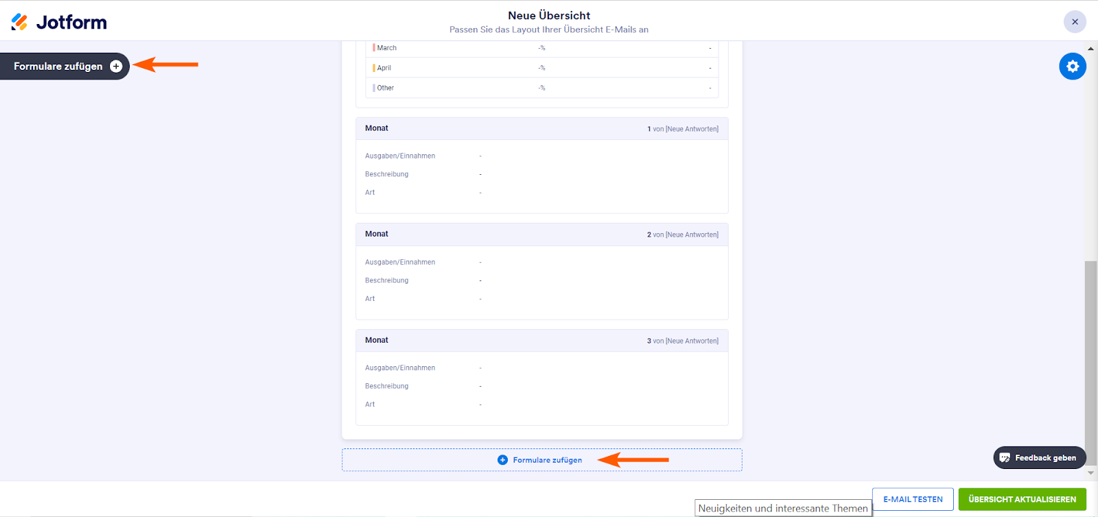 Wenn Sie Ihrer Digest-E-Mail ein weiteres Formular hinzufügen möchten, gibt es zwei Möglichkeiten. Die Erste ist, auf den Button Formulare hinzufügen, auf der linken Seite des Formular-Generators zu klicken. Die zweite Möglichkeit ist, an das Ende der Seite zu scrollen und dort auf Formular hinzufügen zu klicken.