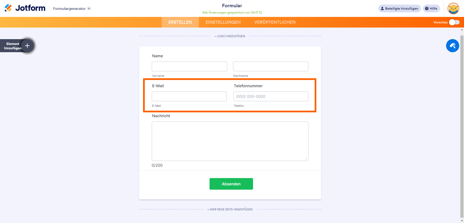 Standardmäßig belegt jedes Feld, welches Sie hinzufügen, eine Zeile in Ihrem Formular. Durch Verkleinern können Sie Ihre Formularfelder in Spalten mit mindestens zwei Feldern in einer Zeile anzeigen.