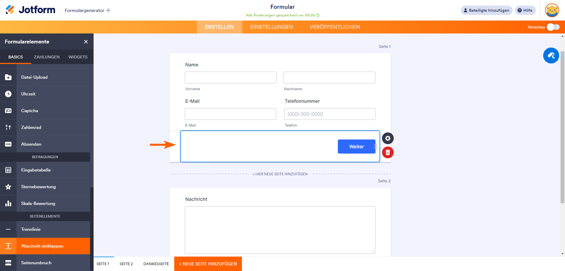 - Fügen Sie im Formular-Generator ein Seitenumbruch-Element zu Ihrem Formular hinzu.