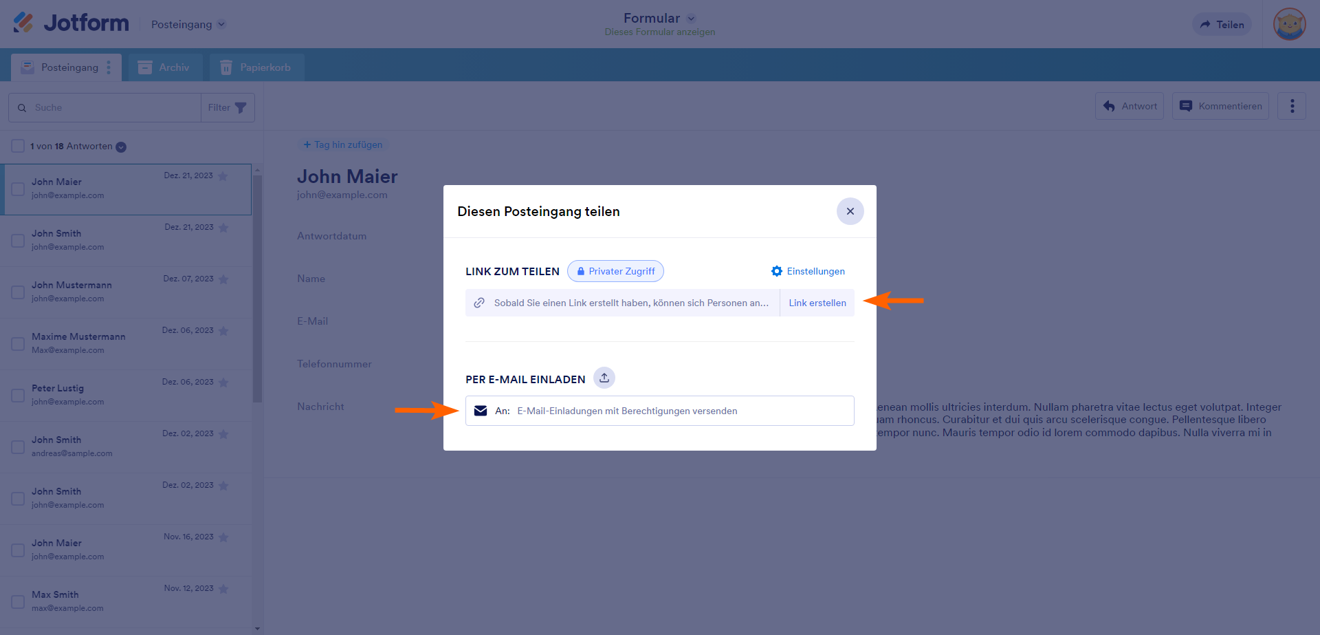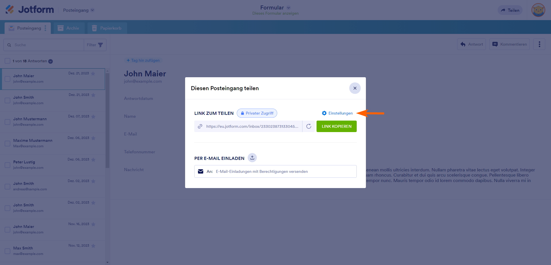 Jotform Inbox ermöglicht es Ihnen, Ihren Posteingang für Ihre Kollegen freizugeben, damit diese Ihre Formulardaten einsehen oder mit ihnen zusammenarbeiten können.