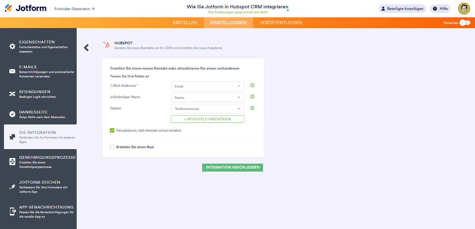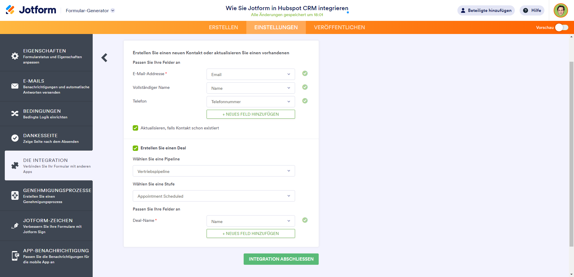 Nachdem Sie Ihr HubSpot-Konto authentifiziert oder ausgewählt haben, wird es mit Ihrem Formular verknüpft und Sie können die Integrationseinrichtung für die ausgewählte Aktion abschließen.