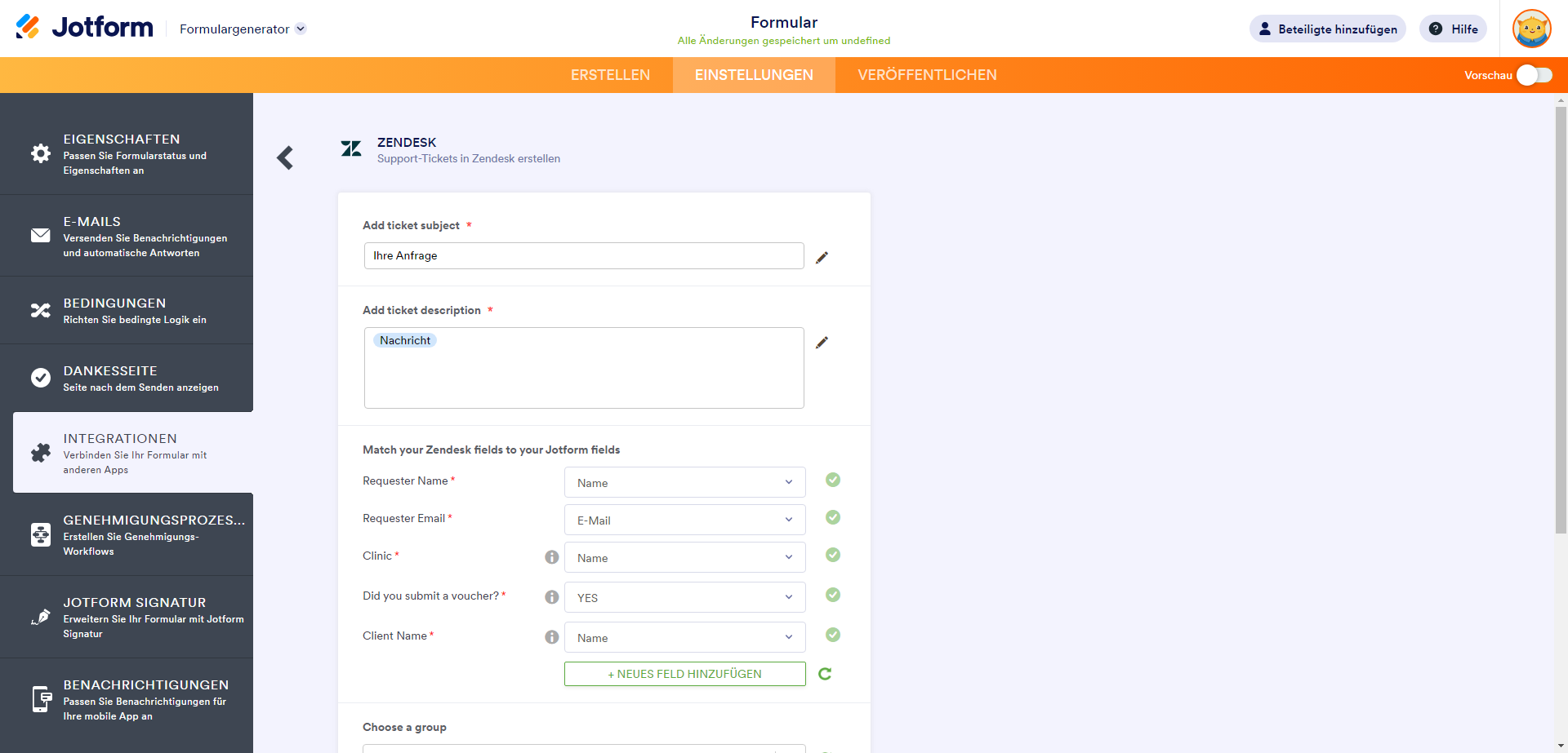 Beim Abgleichen von Zendesk-Feldern mit Ihren Jotform Feldern können Sie auch Folgendes auswählen und zuordnen: Folgendes: