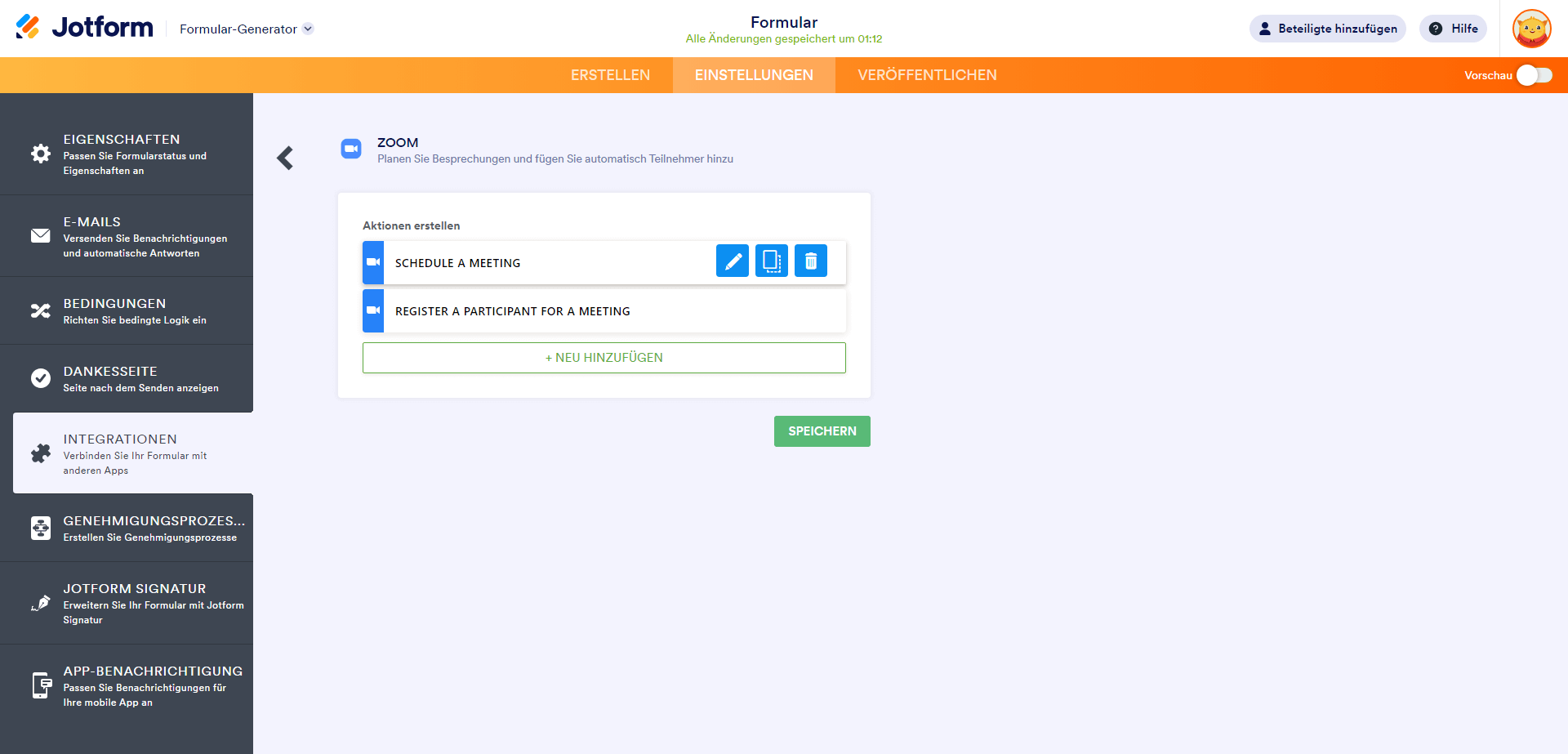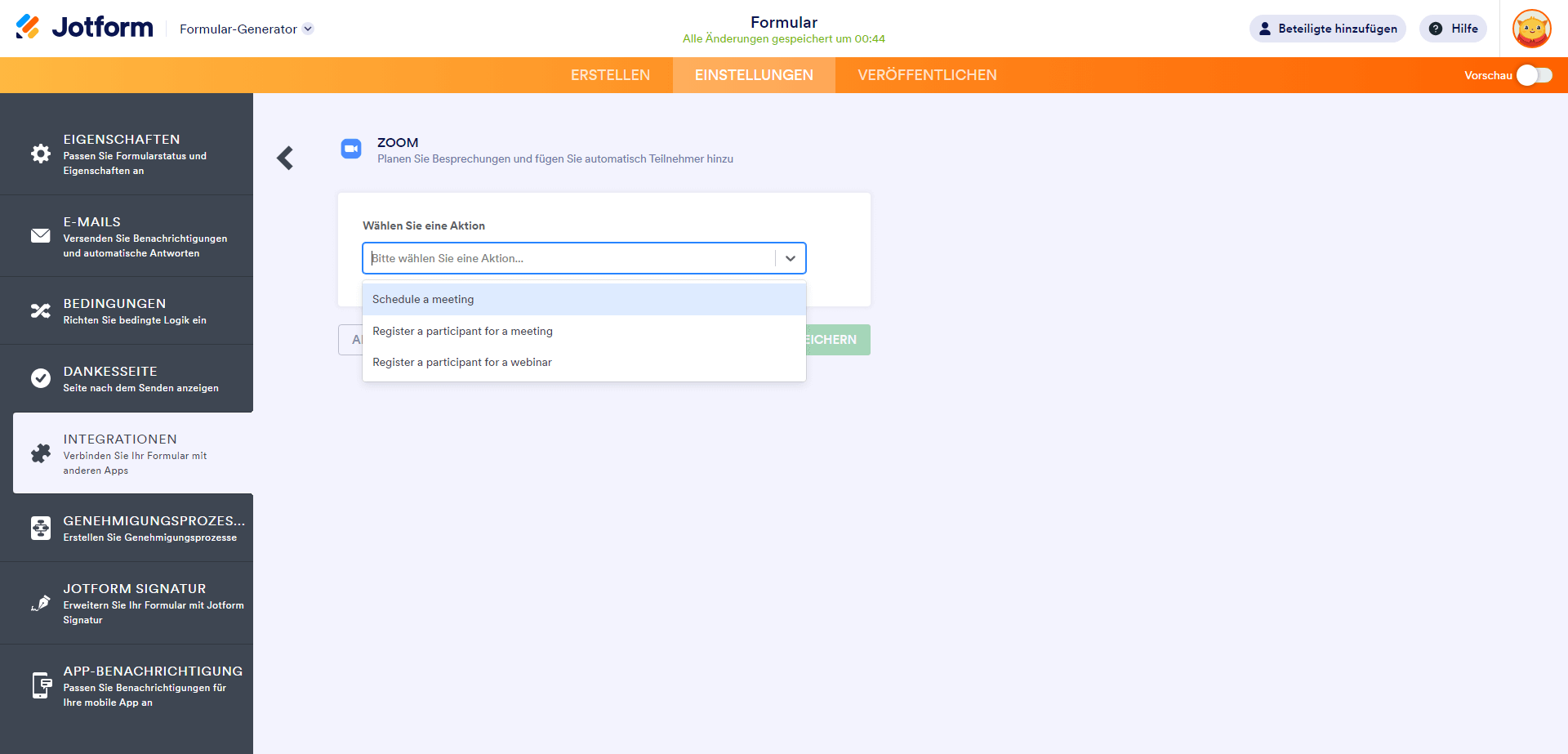 Mit der Option Meeting erstellen können Sie Zoom-Meetings automatisch planen, sobald jemand Ihr Formular absendet. So geht’s: