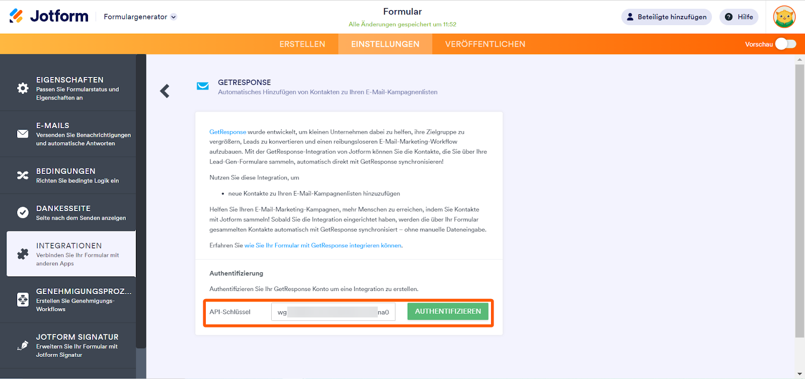 - Geben Sie Ihren GetResponse API-Key ein und klicken Sie auf den Authenticate Button.