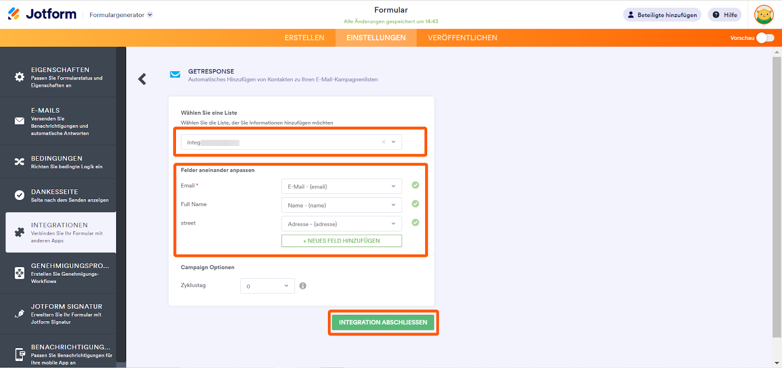 - Markieren Sie Ihre Formularfelder. GetResponse lädt alle Felder aus Ihren GetResponse Formularen. Klicken Sie auf den neues Feld hinzufügen Button, um ein weiteres Feld zuzuordnen.