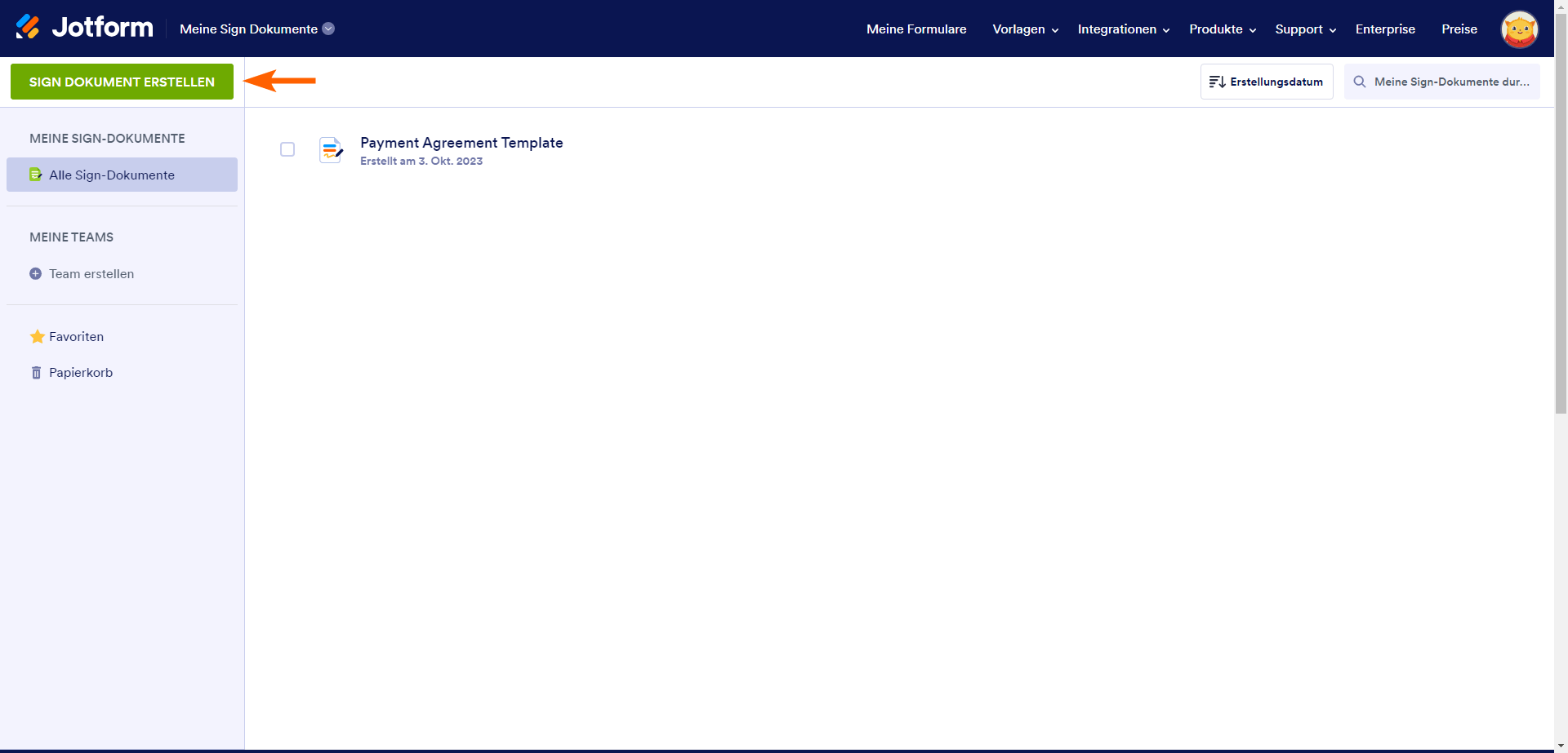 - Klicken Sie dann auf den grünen Button Sign Dokument erstellen auf der linken Seite des Bildschirms.