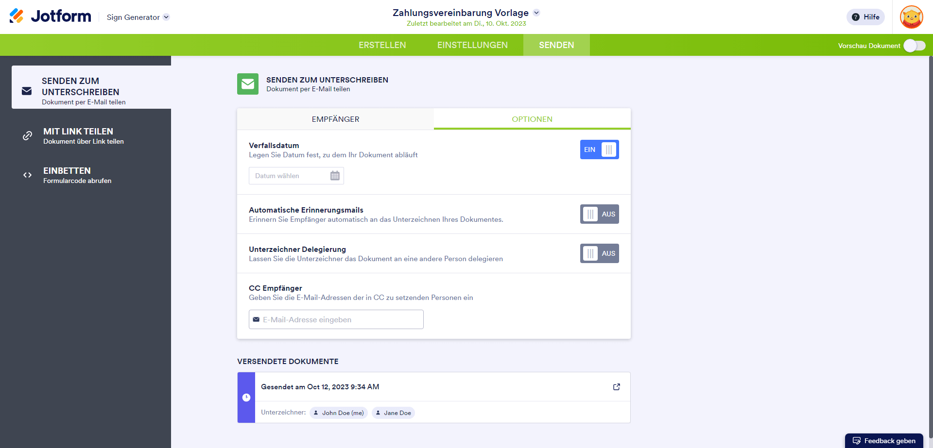 Auf der Registerkarte Optionen können Sie Erinnerungs-E-Mails versenden, Ablaufdaten festlegen, Unterzeichnern das Delegieren an andere Unterzeichner erlauben und CC-Empfänger hinzufügen.