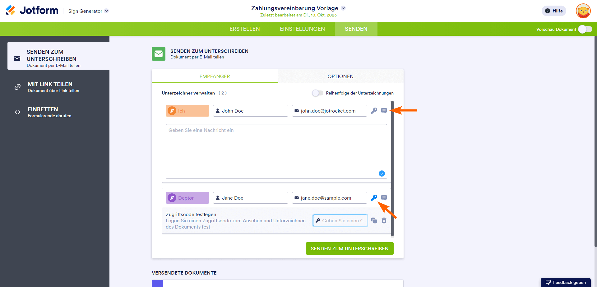 - Klicken Sie auf das Schlüsselsymbol, um einen Zugangscode zu erstellen, und klicken Sie auf die Sprechblase, um eine Nachricht an Ihre Unterzeichner zu schreiben.