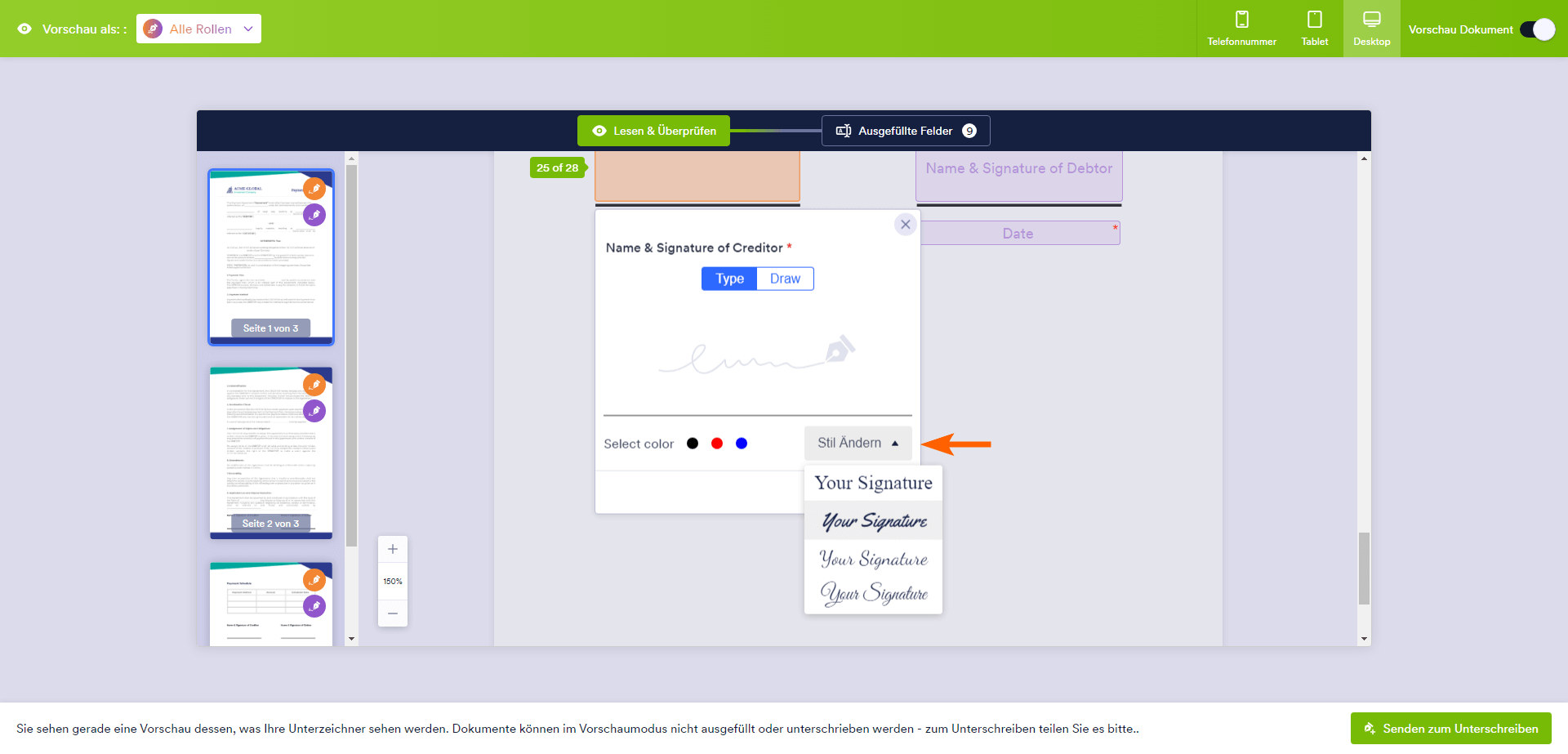 Sie können die Schriftart Ihrer Unterschrift auch im Vorschaumodus ändern. Klicken Sie einfach auf das Unterschriftenfeld und dann auf Stil ändern.