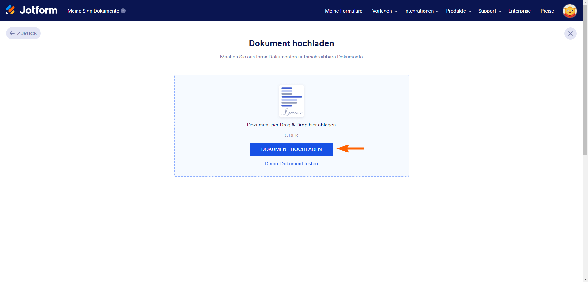 - Sie werden dann aufgefordert, ein Dokument hochzuladen. Sie können entweder ein Dokument von Ihrem Computer ziehen und ablegen oder auf Dokument hochladen klicken, um Ihren Datei-Explorer zu öffnen und ein Dokument hochzuladen. Außerdem können Sie auf Demo-Dokument ausprobieren klicken, wenn Sie die Anwendung testen möchten, bevor Sie Ihre eigenen Dokumente hochladen.