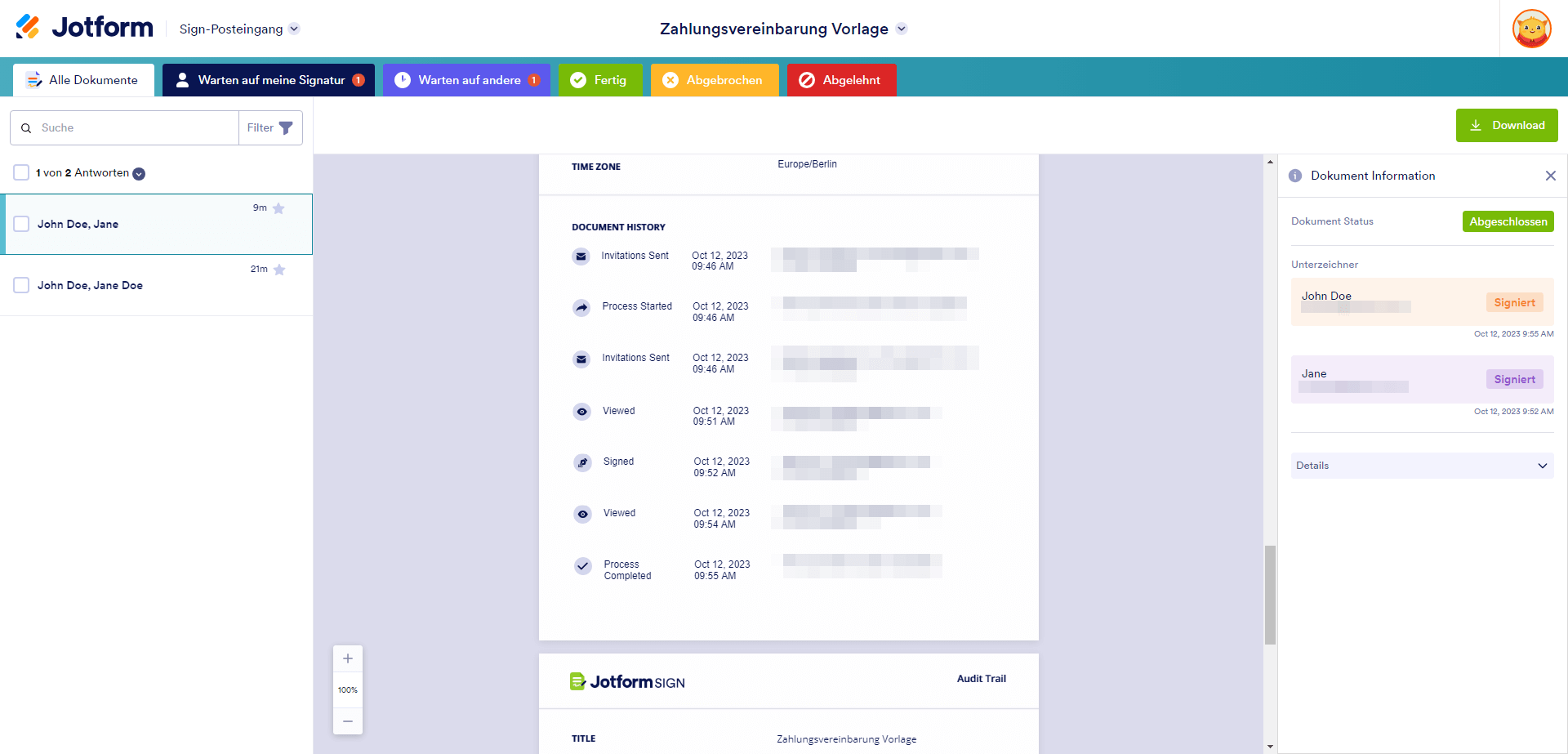 Sobald der Workflow abgeschlossen ist, erhalten alle Beteiligten eine Bestätigungs-E-Mail mit einem Prüfprotokoll. Der Prüfpfad ist im Wesentlichen eine Übersicht darüber, wer Ihr Dokument wann unterzeichnet hat. Der Prüfpfad ist äußerst hilfreich bei der Verfolgung von Arbeitsabläufen und um sicherzustellen, dass alle Beteiligten Ihr Dokument unterzeichnet haben. Sie können den Prüfpfad auch jederzeit in Sign Inbox einsehen.