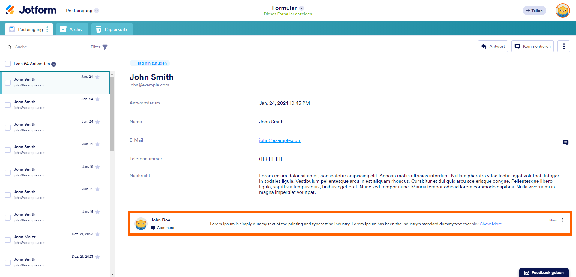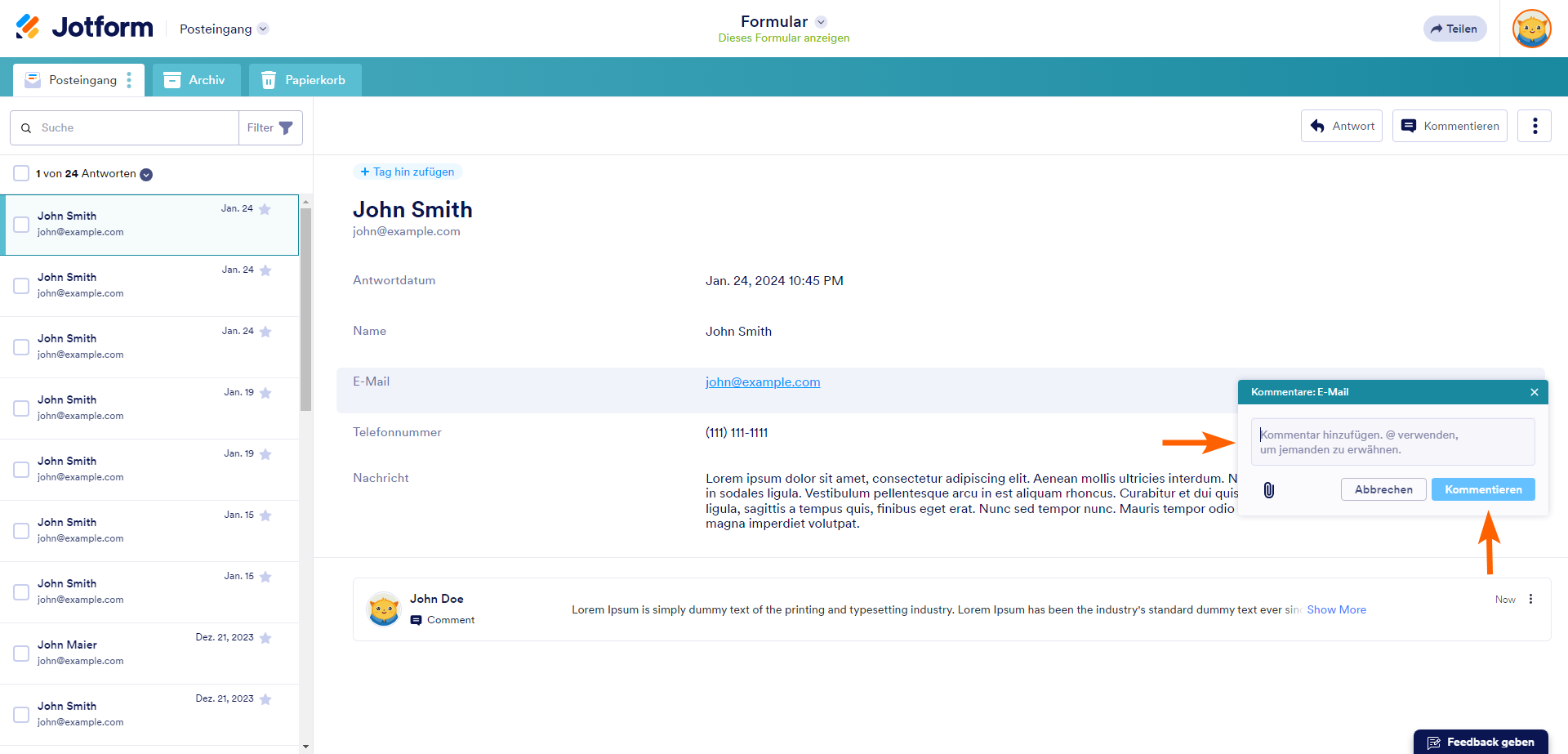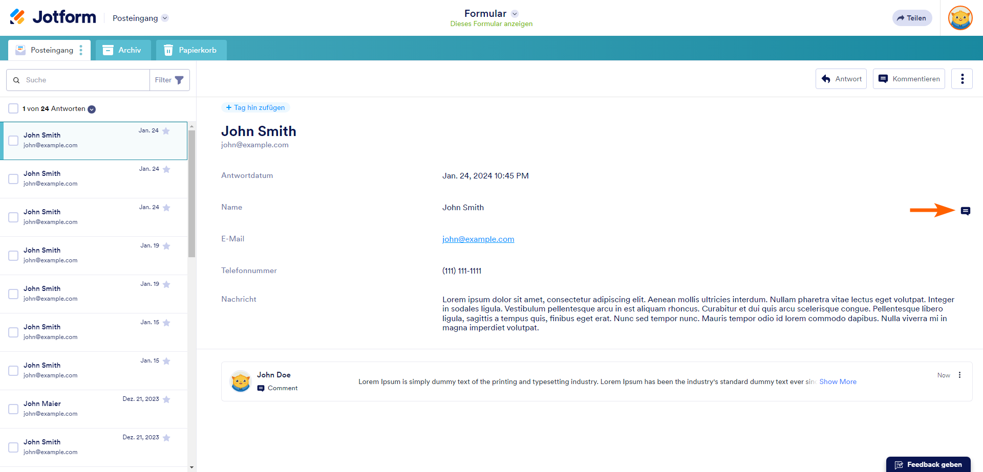 In Jotform Inbox können Sie Kommentare und Antworten zu Formularantworten und Daten hinzufügen. Kommunizieren Sie ganz einfach mit Ihren Kollegen, wenn Sie Ihren Posteingang für Formulare freigeben, um zusammenzuarbeiten.
