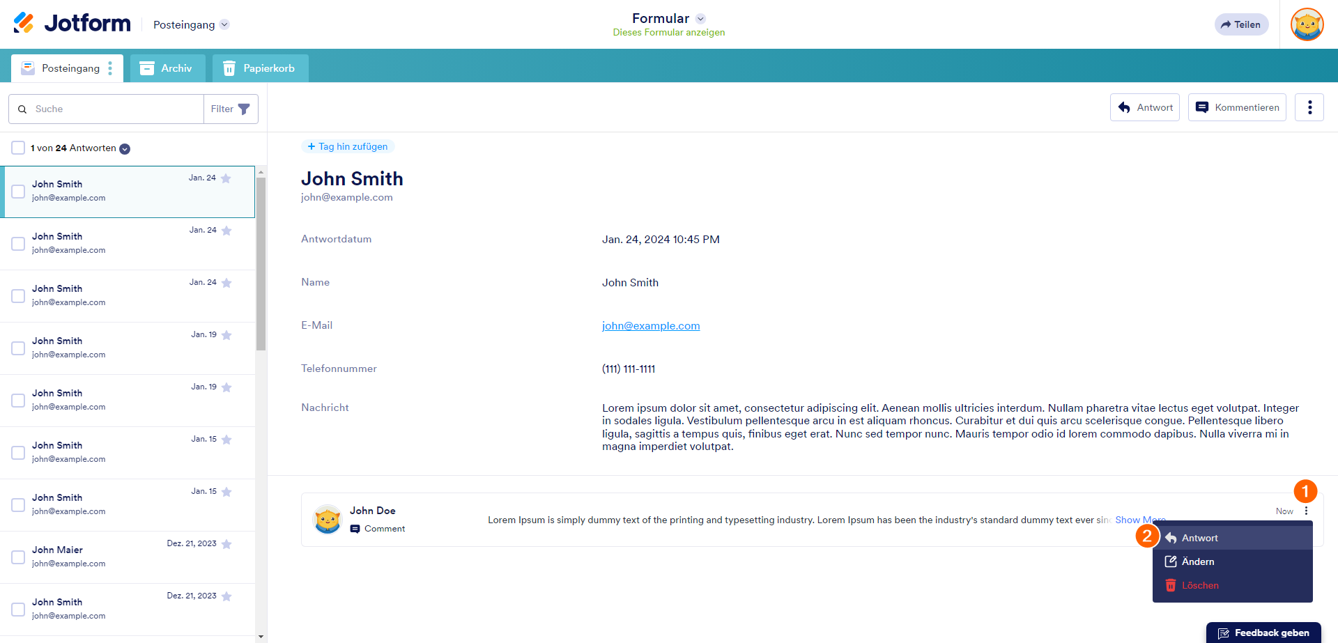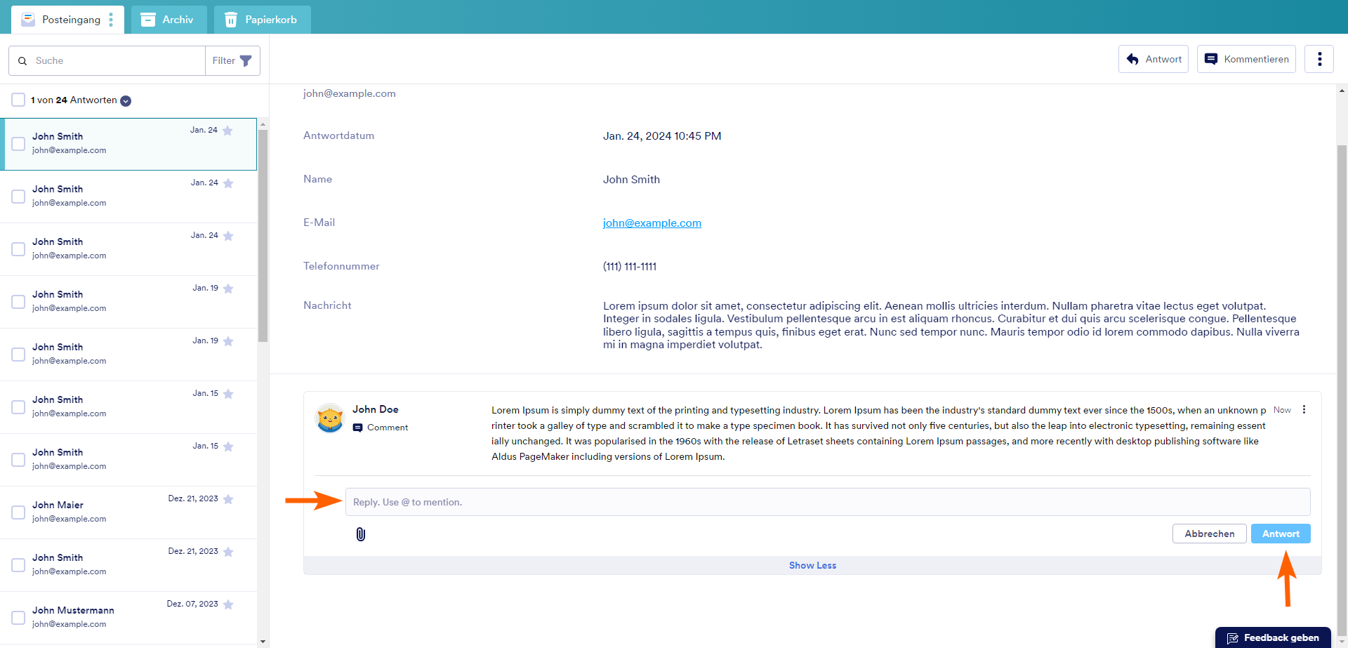 Neben der Anzeige kann jeder, der Zugriff auf Ihren Posteingang hat, auch auf Kommentare antworten.