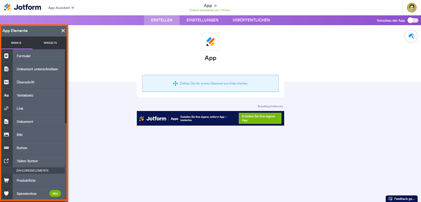Jotform Apps ist ein App Generator, mit dem Sie Ihre eigenen mobilen Apps erstellen können. Durch das Hinzufügen von App-Elementen können Sie Ihre App an Ihre spezifischen Anforderungen anpassen. Ob Formulare, Überschriften, Absätze oder Links – Sie haben die Flexibilität, ein einzigartiges Benutzererlebnis zu schaffen. Informationen zum Erstellen einer App finden Sie unter Apps erstellen.