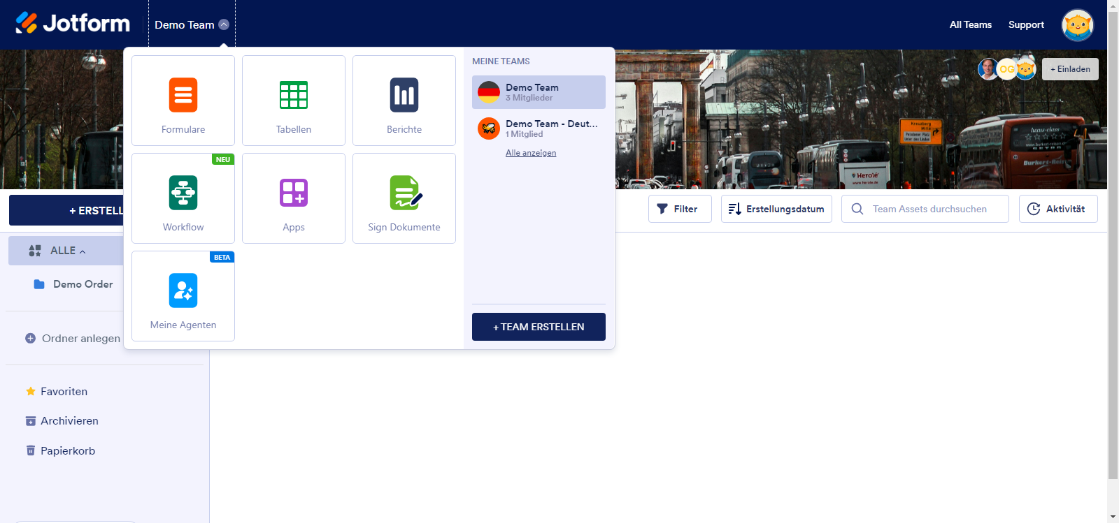 Das Erstellen neuer Assets in Jotform Teams ermöglicht es Ihrem Team, gemeinsam Formulare, KI-Agenten, Workflows, Apps, E-Sign-Dokumente, Tabellen, Berichte oder Boards in einem zentralen Arbeitsbereich zu erstellen und zu verwalten. Egal, ob Sie ein Formular entwerfen oder einen Workflow einrichten, Jotform Teams hilft, alles organisiert und für Ihr gesamtes Team zugänglich zu halten.