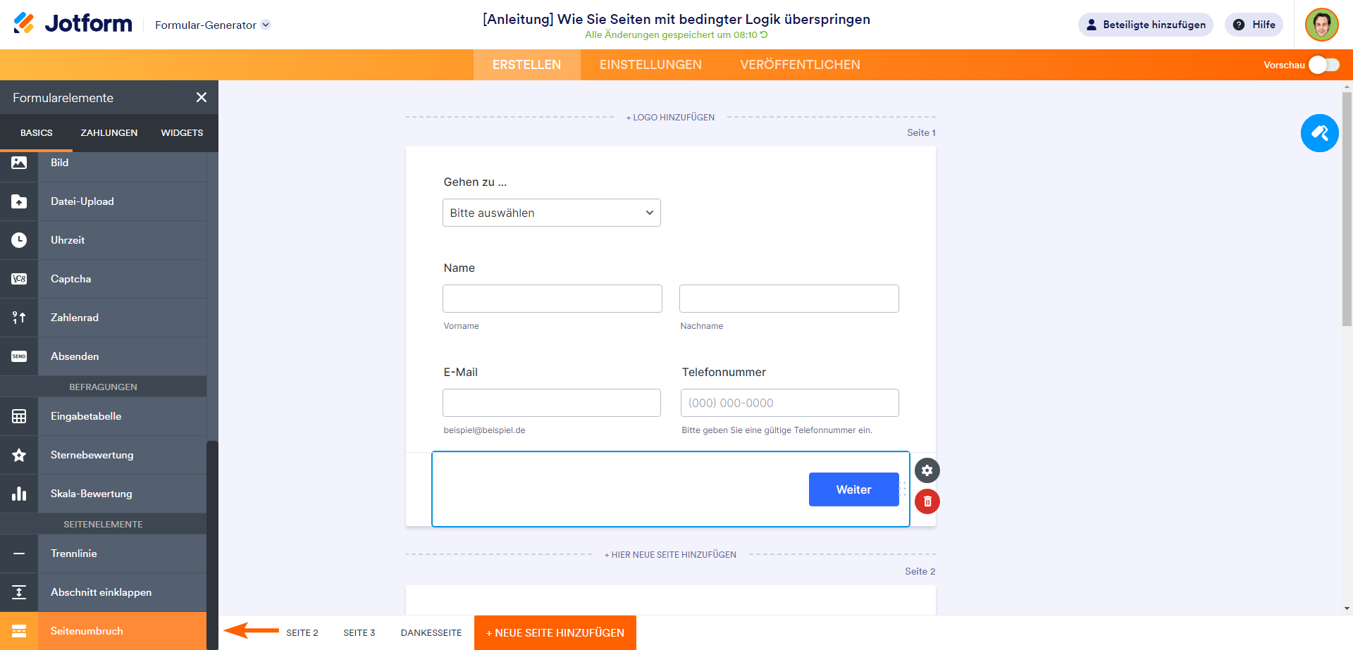 - Mit dem Formularelement Seitenumbruch können Sie Ihr Formular mehrseitig gestalten.