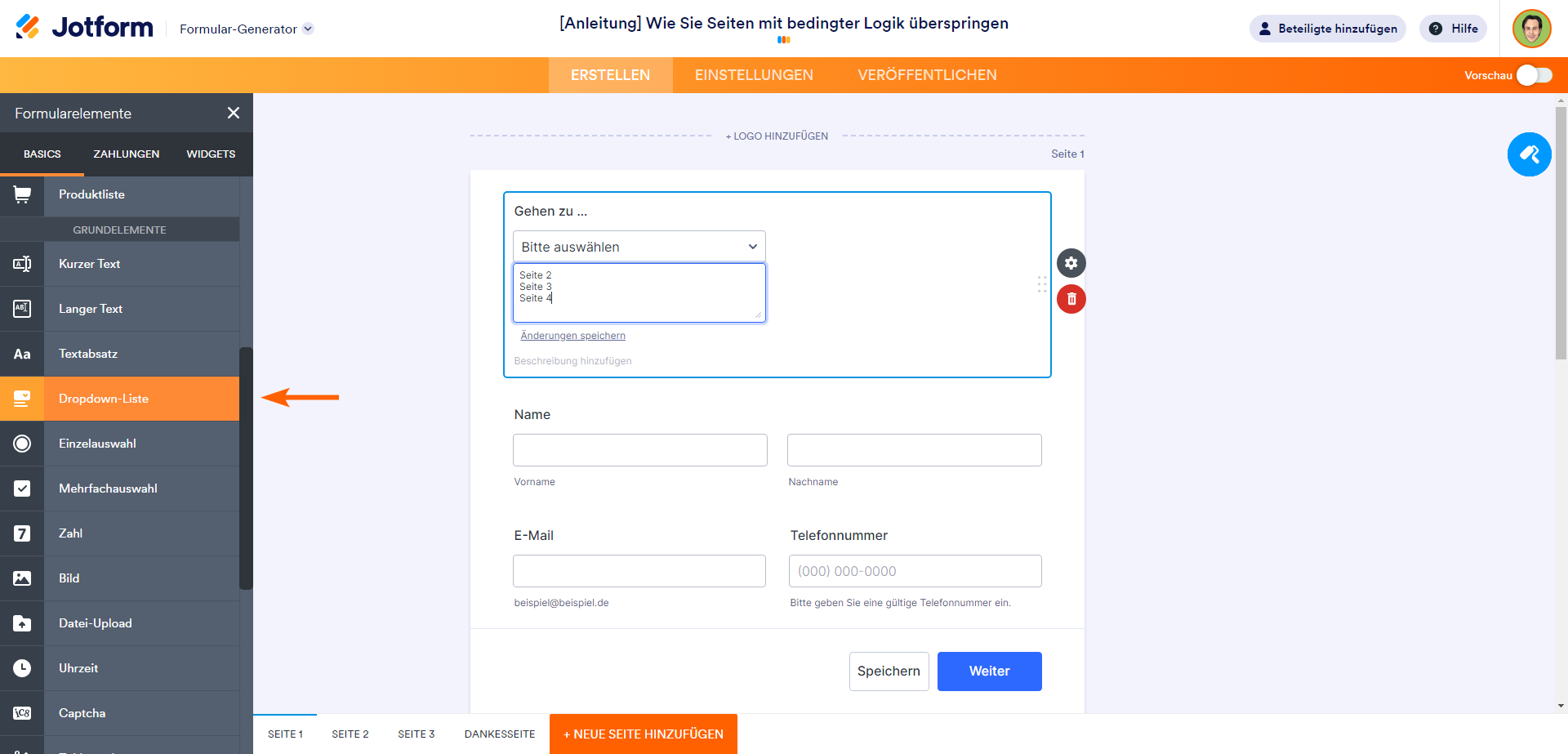 In dieser Anleitung trägt das Dropdown-Menü die Bezeichnung Sprung zu. Dies dient als Grundlage für das Überspringen von Seiten. Je nach Funktion Ihres Formulars können Sie auch andere Formularelemente wie Einzelauswahl oder Kurztext verwenden.