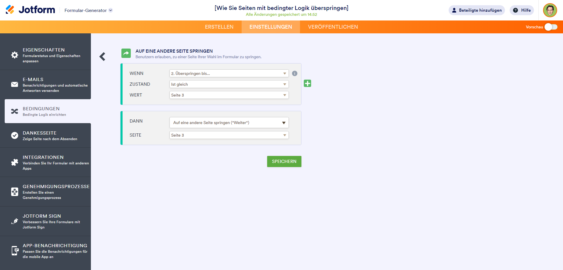 Im Beispielformular lautet die bedingte Logik zum Weiterleiten zu Seite 3 wie folgt: