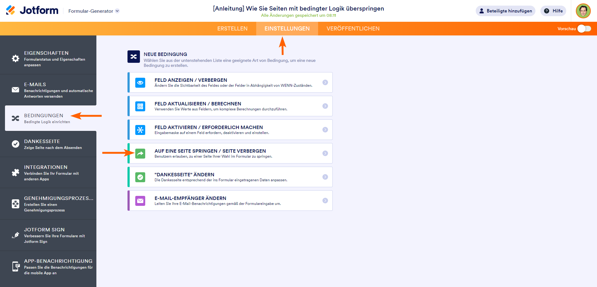 - Neue Bedingung Zur Seite springen/Seite ausblenden hinzufügen.