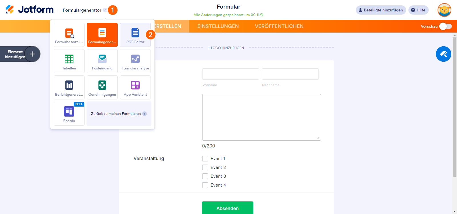 - Im Formular-Generator klicken Sie die Produkt-Auswahl (Pfeil Icon) neben dem Jotform Logo.