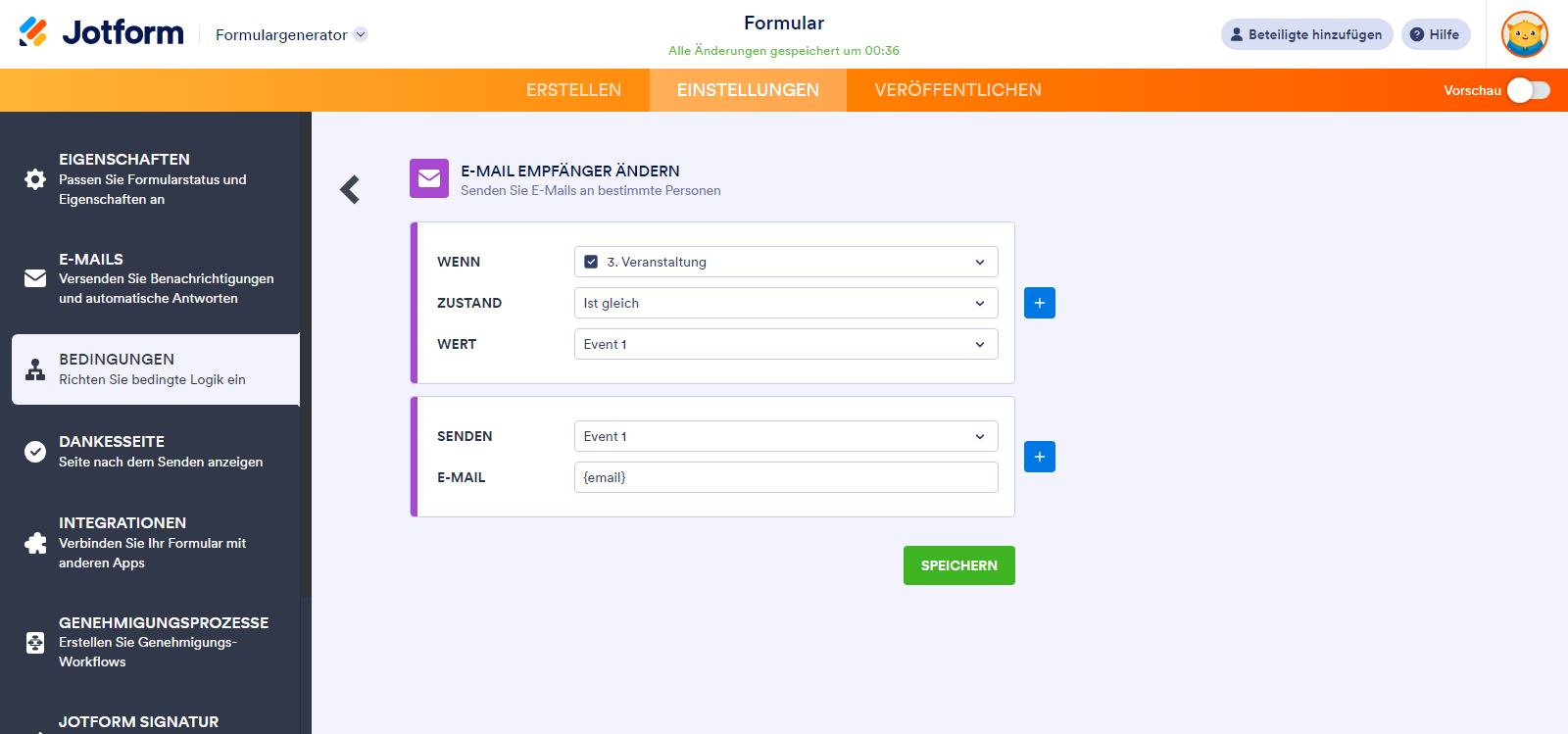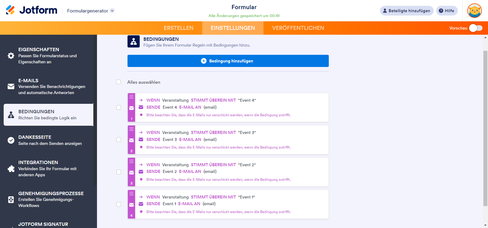 Im letzten Schritt wird die bedingte Logik so eingerichtet, dass jede automatische Antwort je nach Auswahl im Formular an den Nutzer verschickt wird.