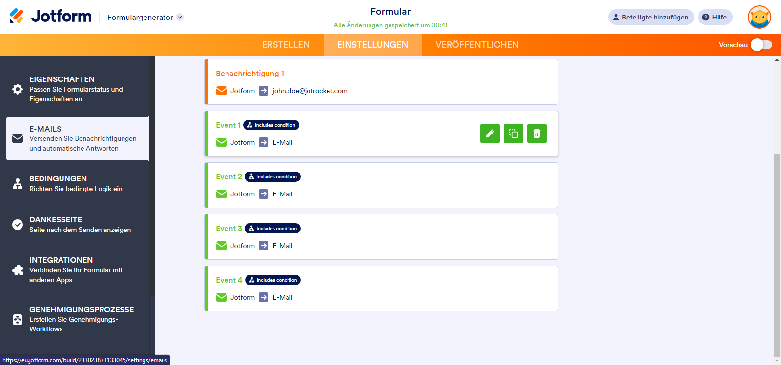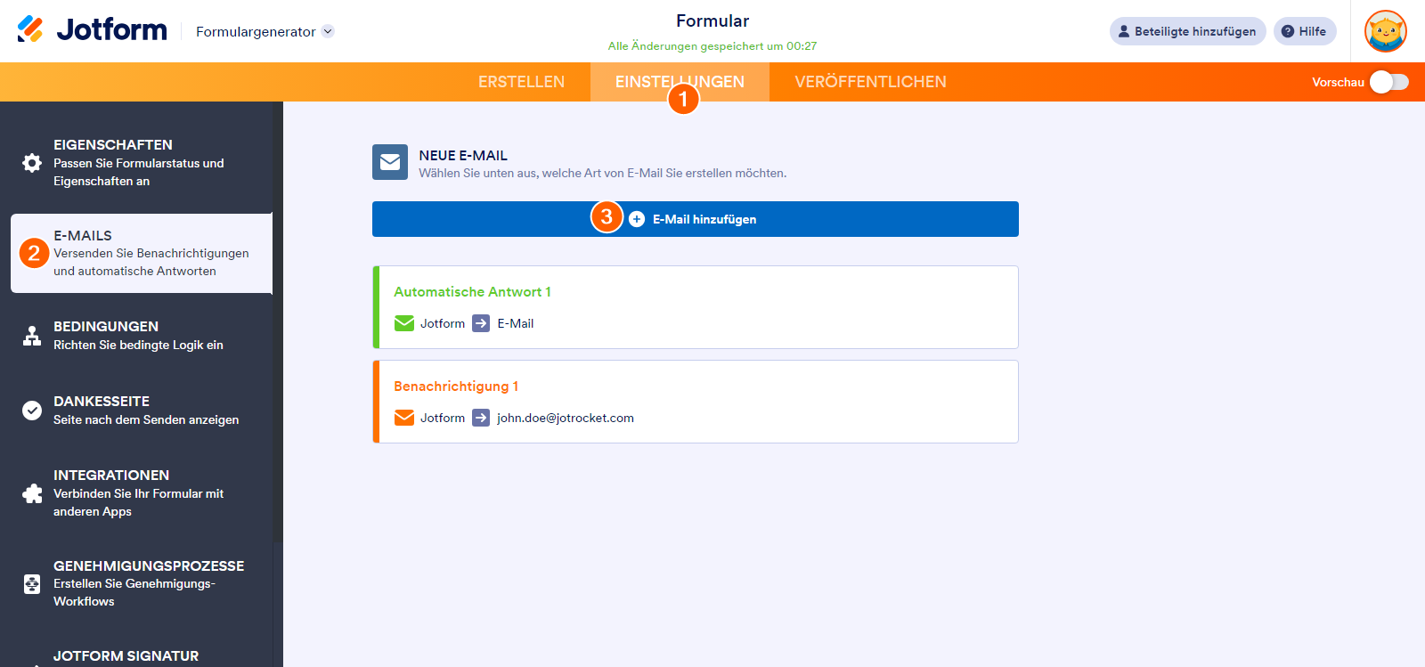 - Im Formular Generator klicken Sie auf den Reiter Einstellungen.
