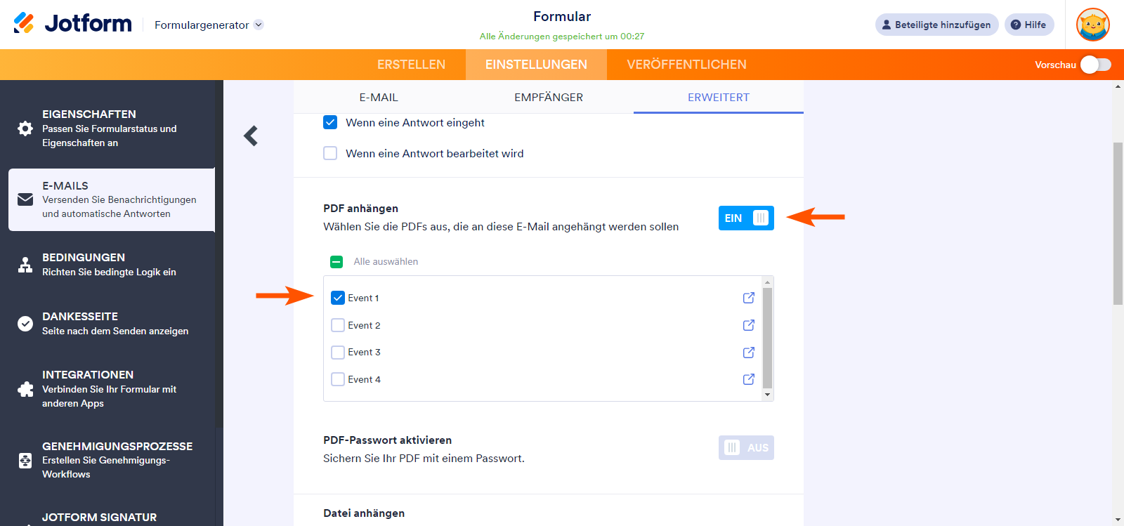- Als Nächstes schalten Sie die Option PDF anhängen durch Anklicken des Schalters ein.