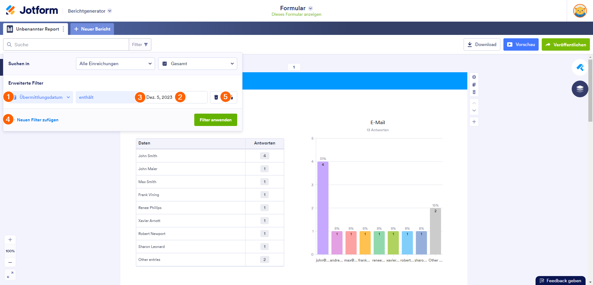 Wenn Sie Berichte zu Ihrem Formular für bestimmte Daten einsehen müssen, können Sie diese nach Einreichungsdatum filtern: