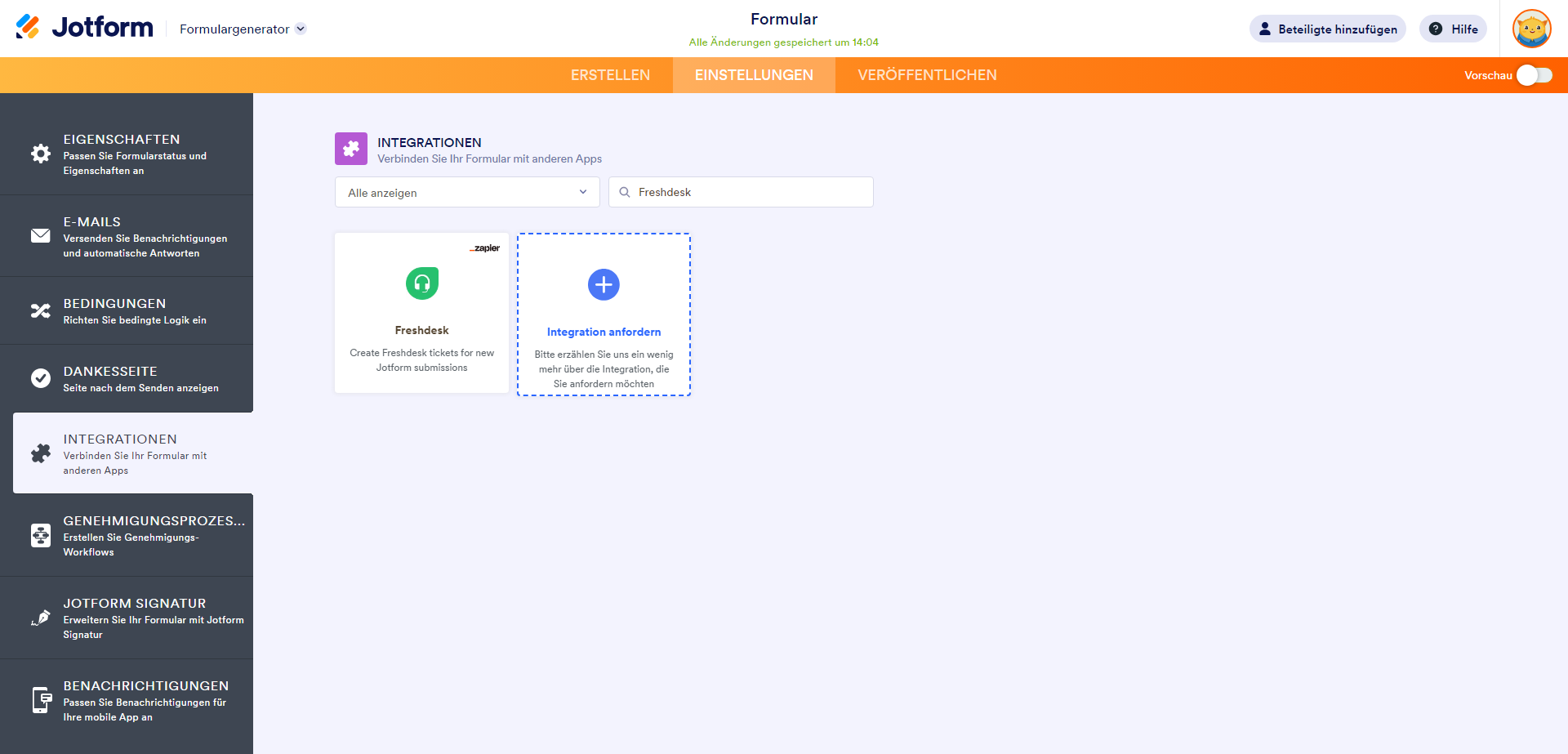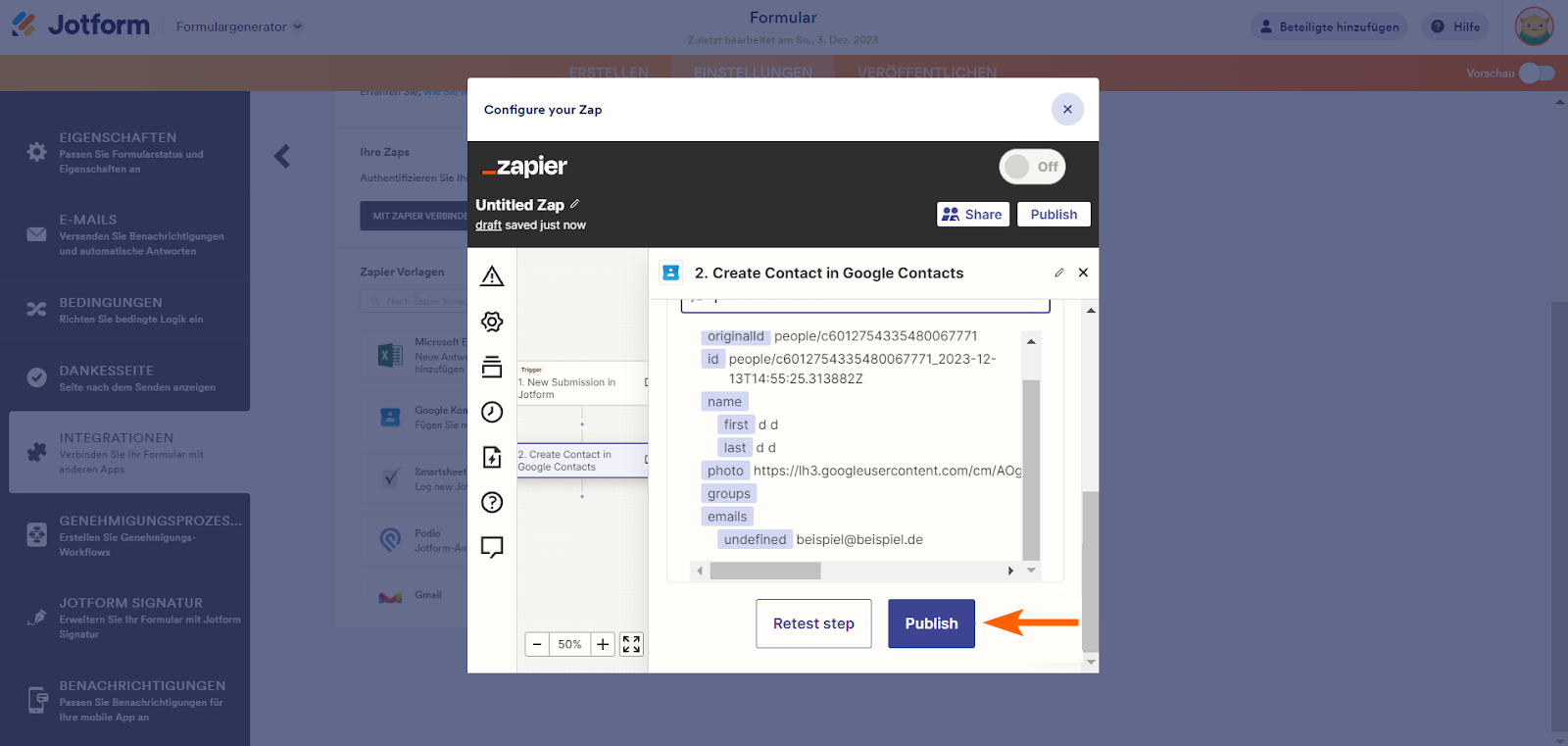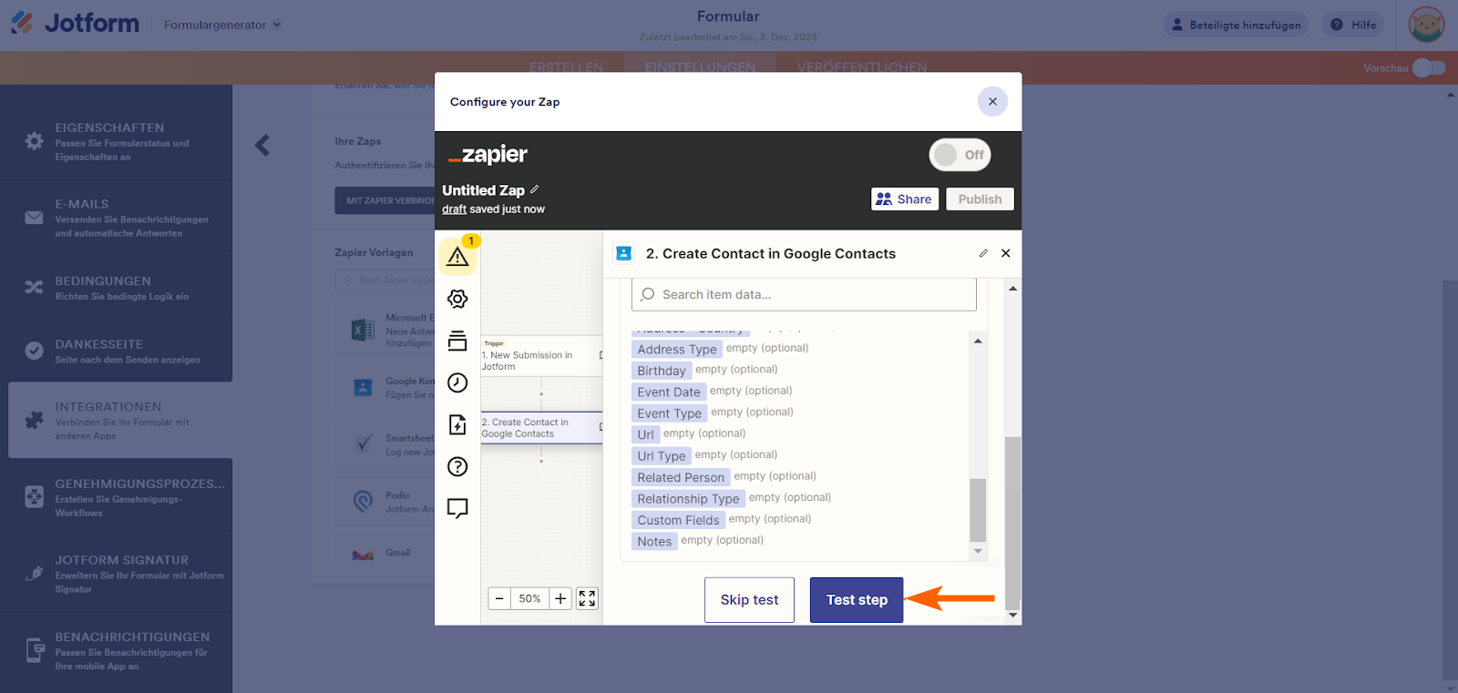 Einrichten von Zaps im Formular-Generator mit dedizierter Integration