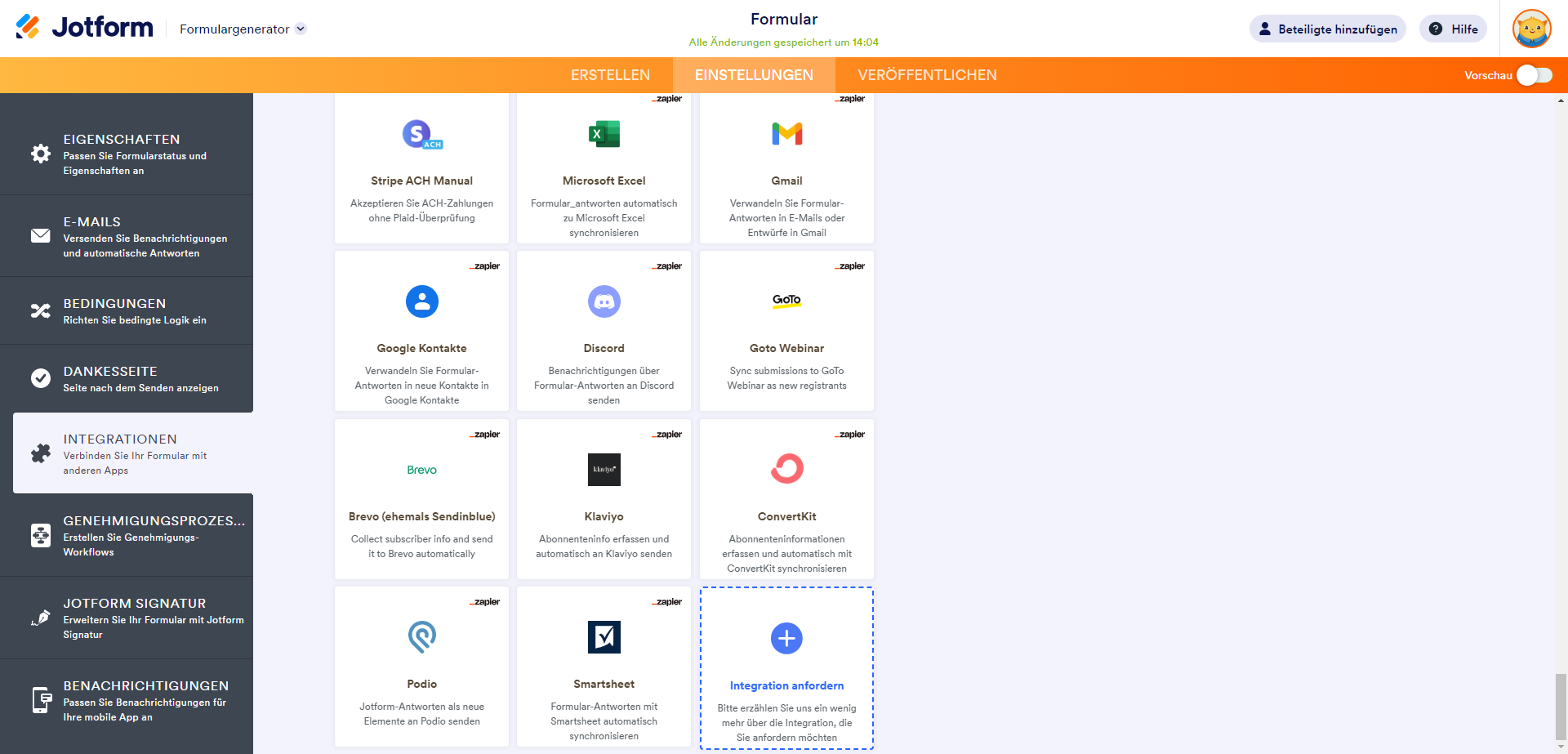 In der Rubrik Integrationen finden Sie die von Zapier betriebenen Apps. Derzeit werden zehn Apps in der Liste angezeigt.
