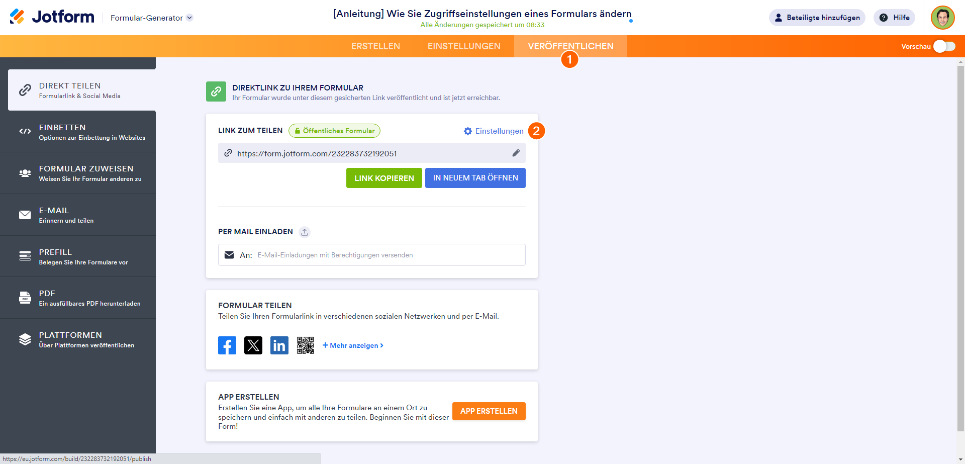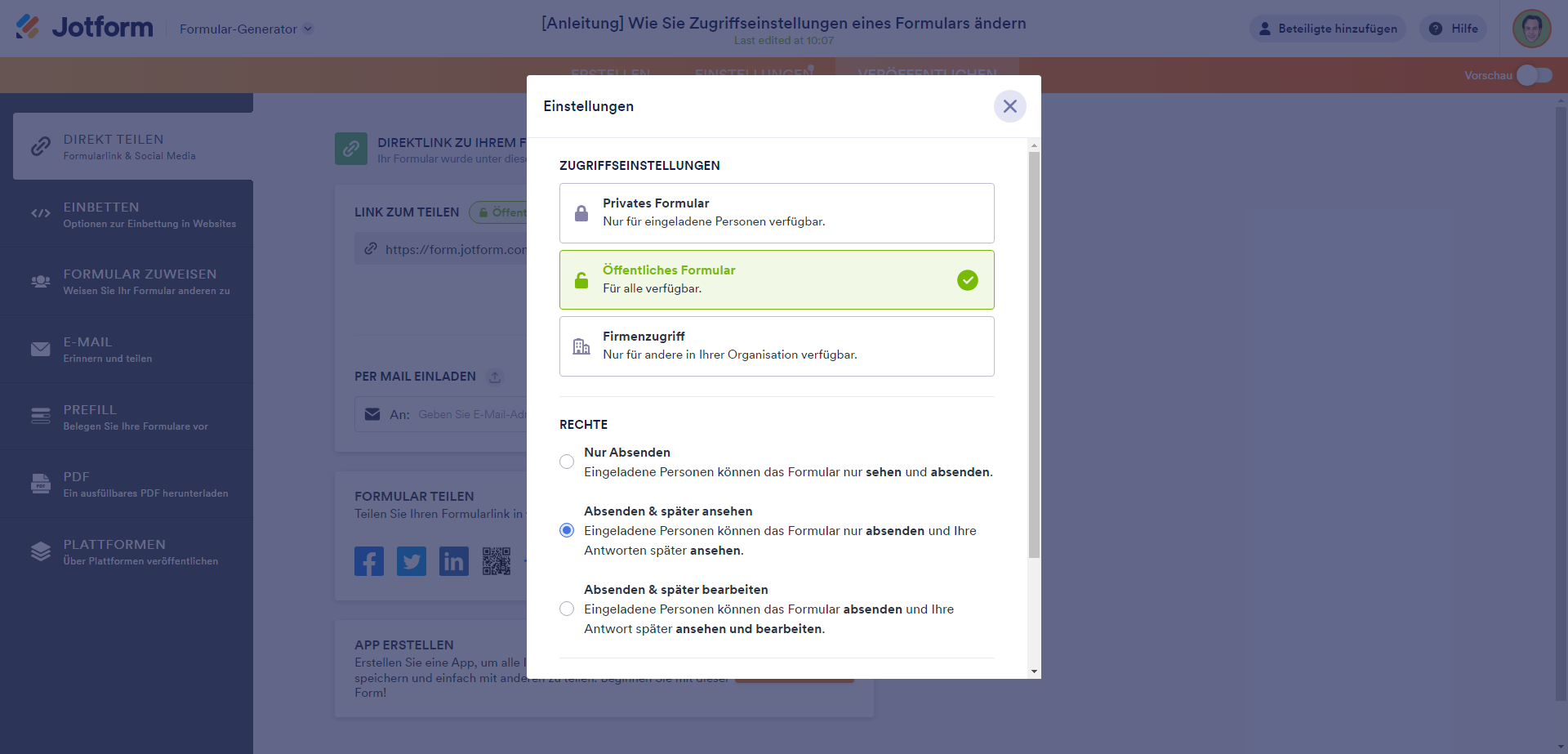 So ändern Sie die Zugriffseinstellungen Ihres Formulars: