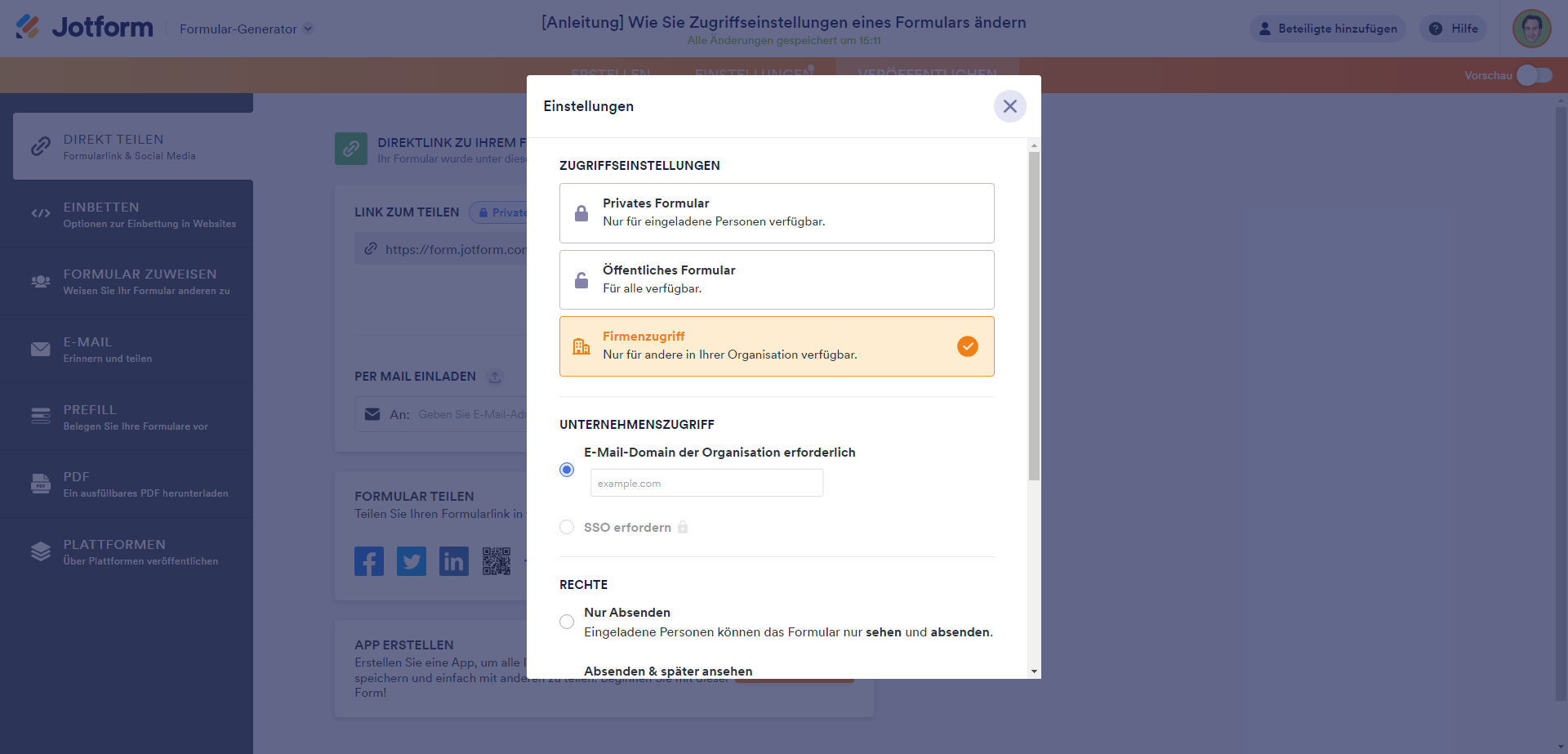 Firmenzugriff bedeutet, dass nur eingeladene Personen mit einer E-Mail-Adresse aus der in den Einstellungen festgelegten Domäne auf Ihr Formular zugreifen können.