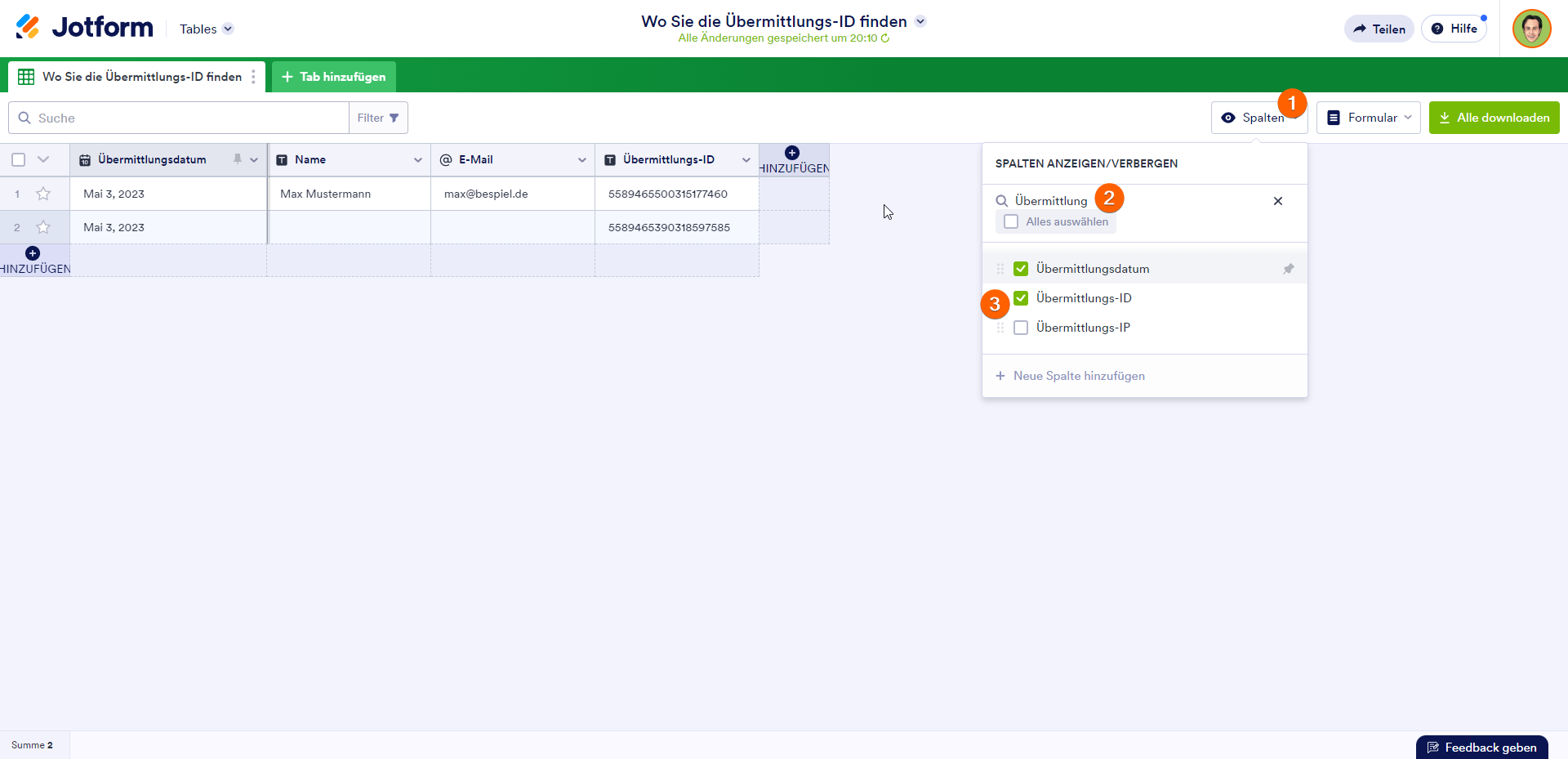- Aktivieren Sie unter Spalten ein-/ausblenden die Option Übermittlungs-ID.