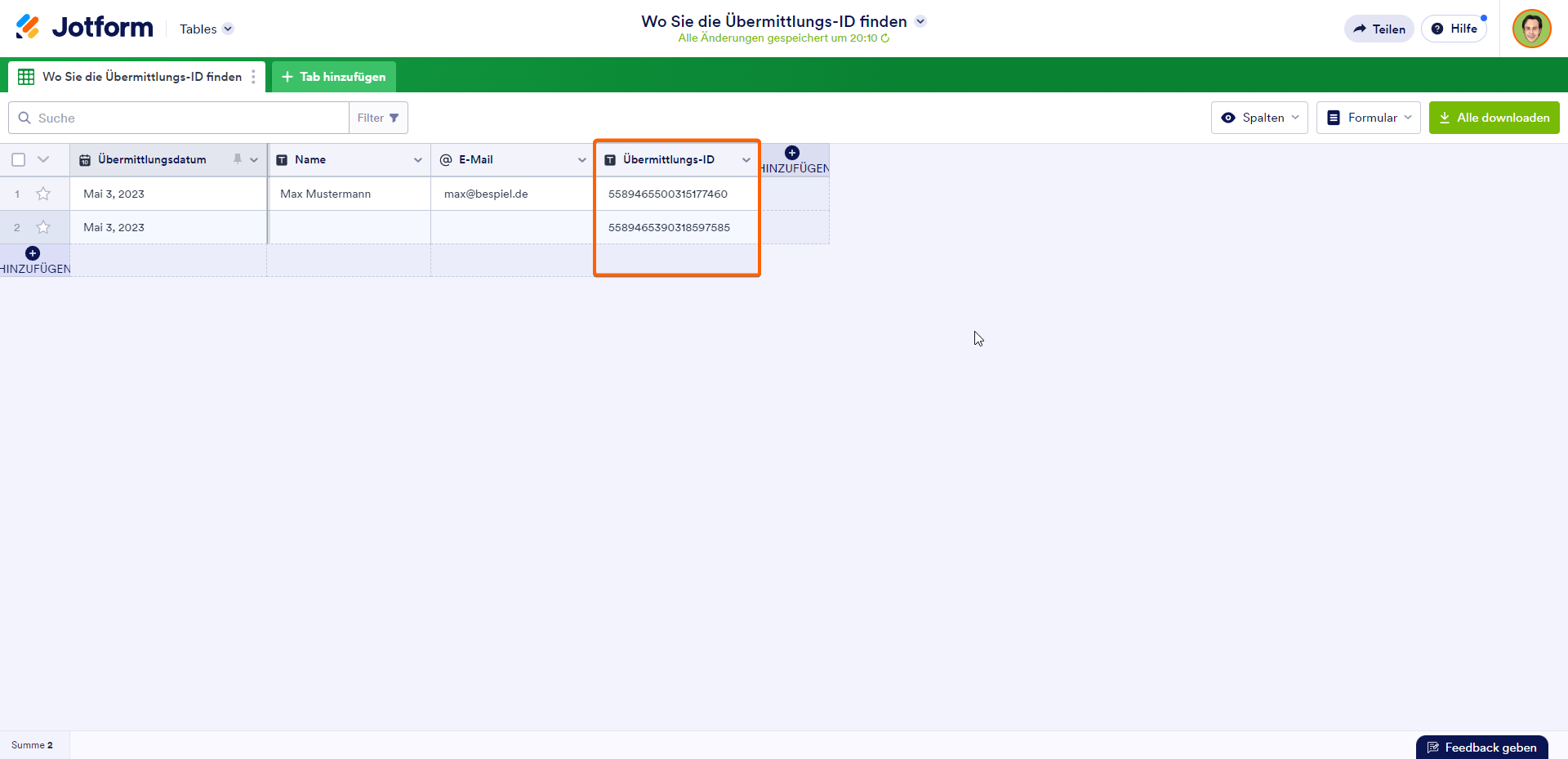 Sie können jetzt die eindeutige ID jedes Eintrags in der Spalte Übermittlungs-ID einsehen.