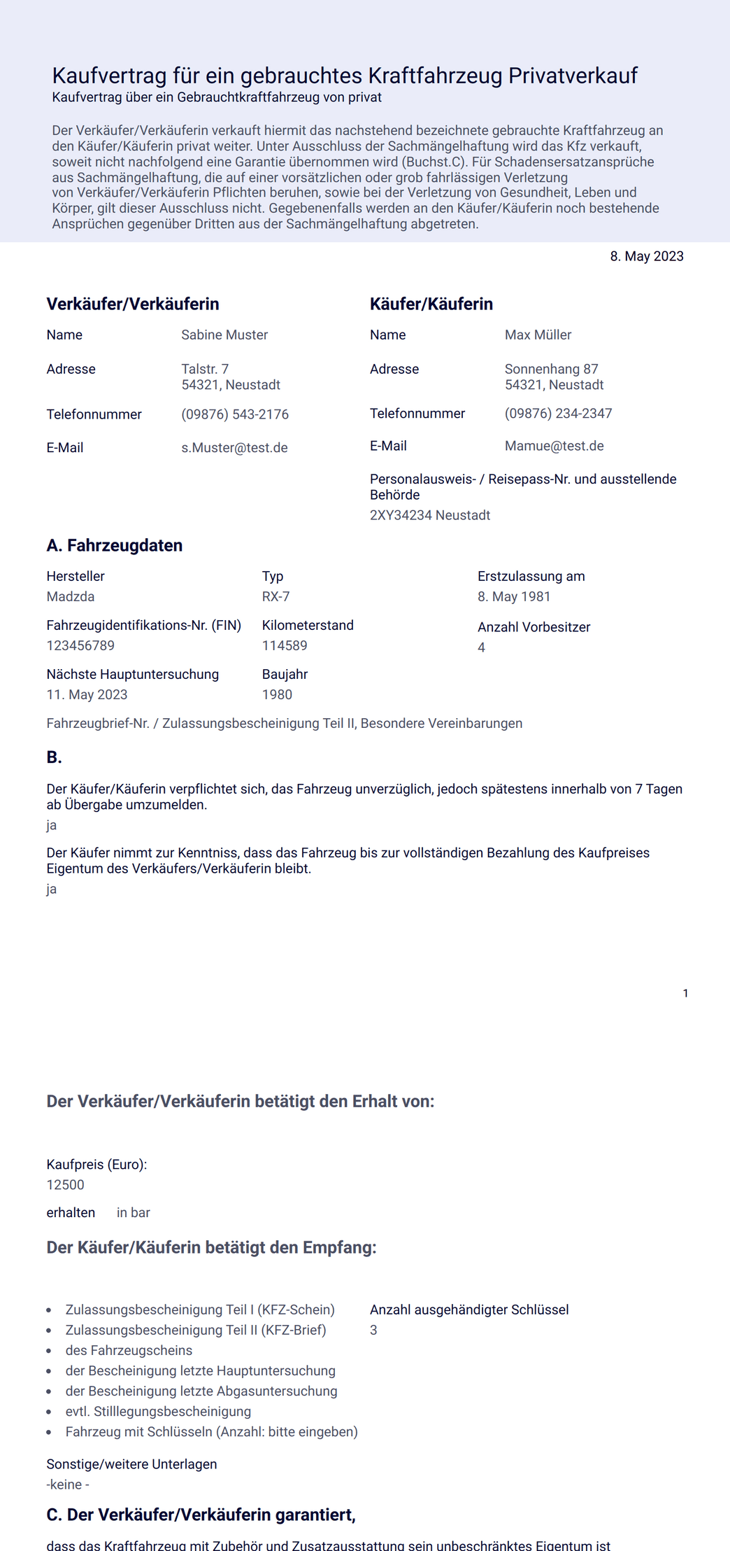 Eine Fahrzeug Kaufvertrag PDF-Vorlage ist dazu da, Käufer und Verkäufer dabei zu helfen, einen legalen, rechtsverbindlichen Kaufvertrag aufzusetzen. Ob Moped, Motorrad oder Auto, mit dieser Fahrzeug Kaufvertrag PDF-Vorlage können Sie im Nu einen Besitzerwechsel bei einem gebrauchten Kraftfahrzeug durchführen. Mit dieser PDF-Vorlage erfassen Sie rechtsverbindliche Unterschriften, die den Vertrag offiziell gültig machen. Außerdem erfasst dieser Fahrzeug Kaufvertrag die persönlichen Informationen von Verkäufer und Käufer, sowie die Daten des zu verkaufenden Fahrzeuges. Diese Vorlage hilft nicht nur dem Verkäufer eines Gebrauchtfahrzeuges dabei, sein Fahrzeug rechtmäßig zu verkaufen, sondern gibt dem Käufer auch die Garantie, dass das Fahrzeug keine bekannten Schäden oder Probleme aufweist.