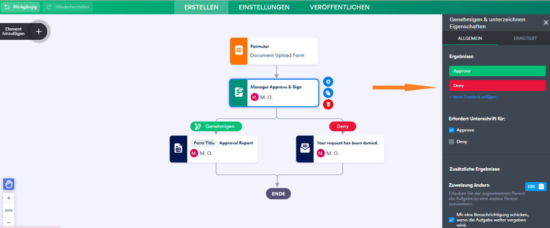 Um benutzerdefinierte Ergebnisse zu erstellen, klicken Sie auf das Approvalselement und wählen dann das Zahnradsymbol, um das Menü Approvalseigenschaften zu öffnen. Über den Link Neues Ergebnis hinzufügen können Sie so viele Ergebnisse erstellen, wie Sie möchten. Stellen Sie jedoch sicher, dass Sie den gewünschten Ergebniswert bestätigen.