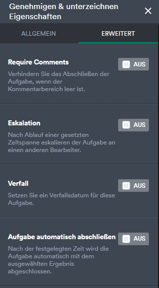 Der Eigentümer des Genehmigungs-Workflows kann ein bestimmtes Datum und eine bestimmte Uhrzeit als Fälligkeitsdatum für eine Genehmigung wählen. Wenn die Aufgabe bis dahin nicht erledigt ist, kann er die Genehmigung entweder an eine andere Person deligieren, automatisch mit einem vorgewählten Ergebnis abschließen oder die Genehmigungsanfrage verfallen lassen. Dies ist eine praktische Funktion, wenn die Genehmiger im Urlaub sind oder rund um die Uhr in Besprechungen stecken. Sie können die Deligierungsfunktion im erweiterten Bereich der Genehmigungseigenschaften aufrufen.