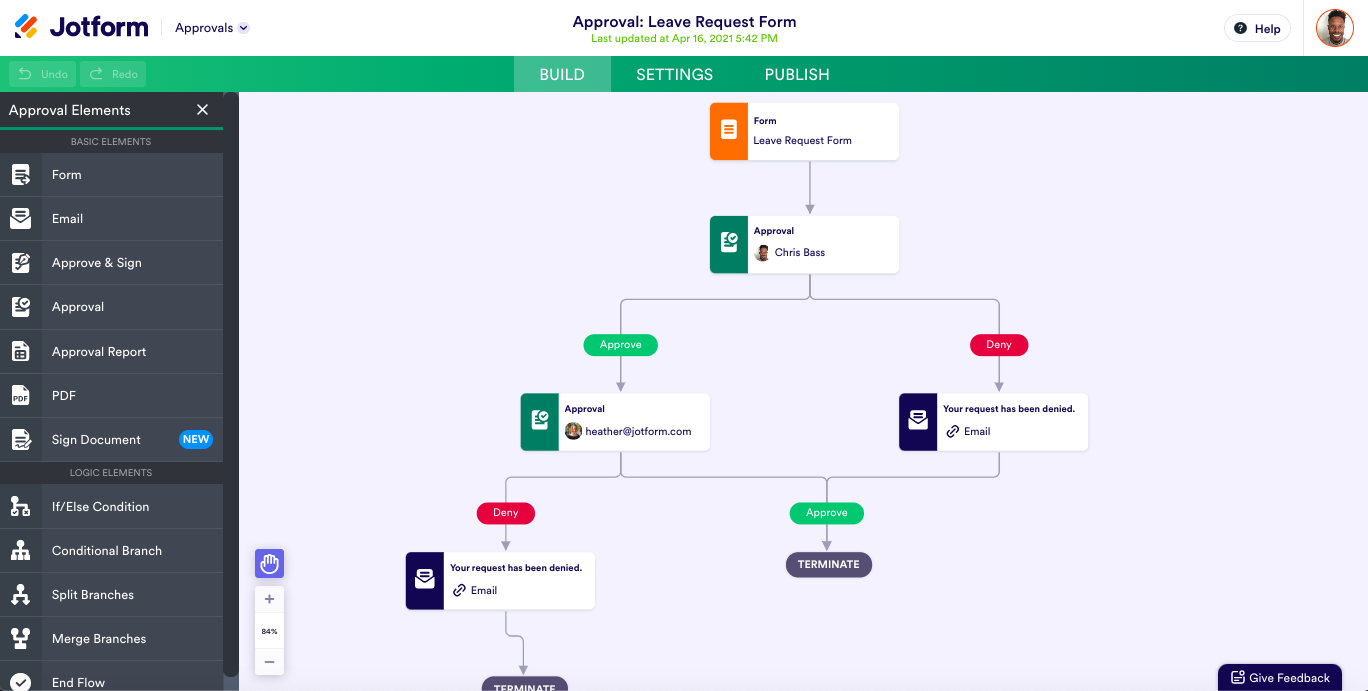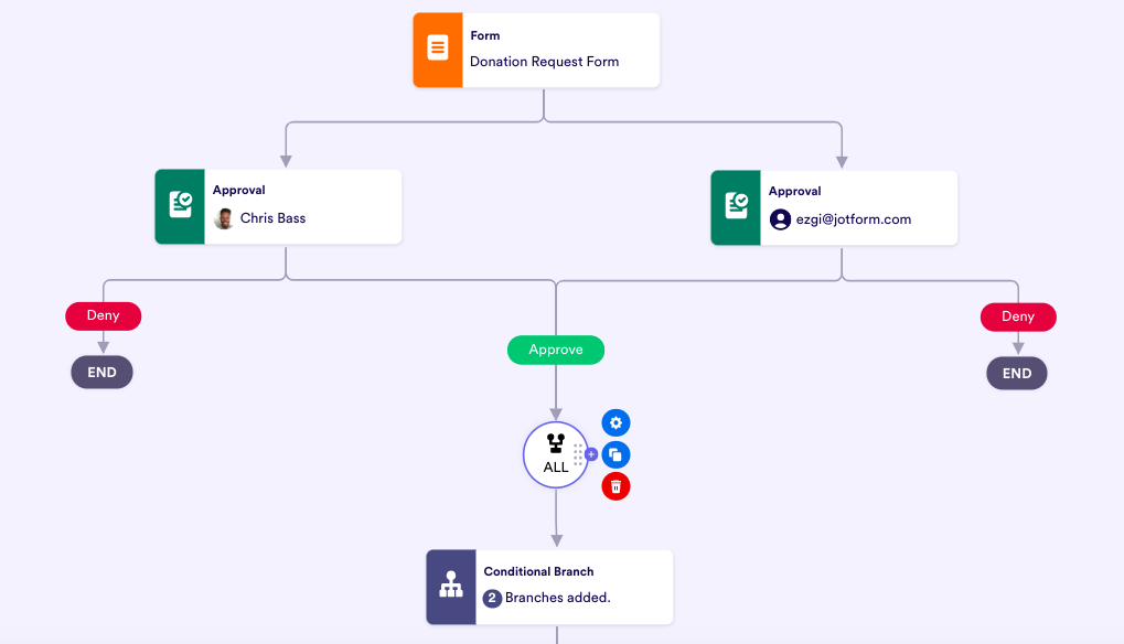 Wir haben bereits über die Möglichkeit der bedingten Verzweigung in Jotform Approvals gesprochen. Die bedingte Logik ist die Kraft unter der Haube Ihres automatisierten Workflows. Indem Sie die Bedingungen, die im Genehmigungsprozess Ihres Unternehmens häufig auftreten, proaktiv festlegen, machen Sie den Prozess für alle Beteiligten effizienter – für die Genehmigenden, die Antragsteller und für Sie selbst als Eigentümer des Workflows.