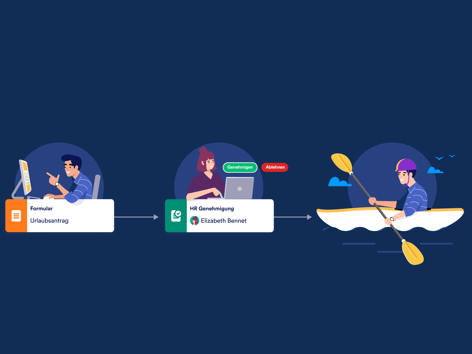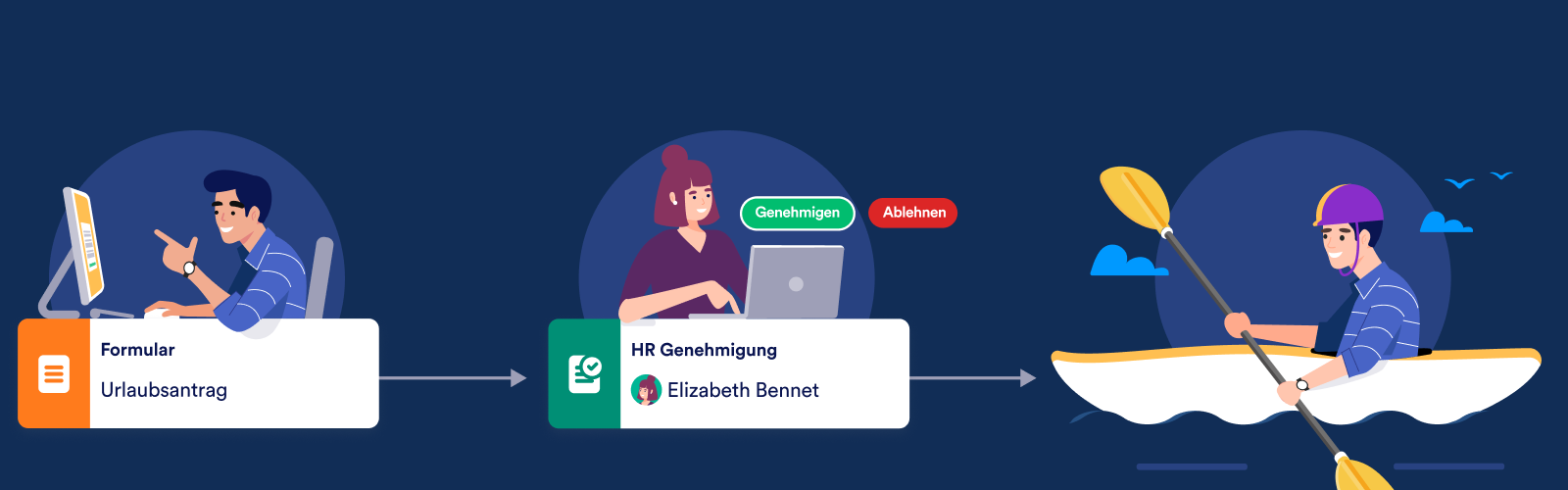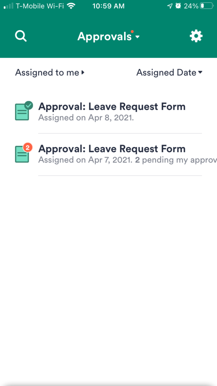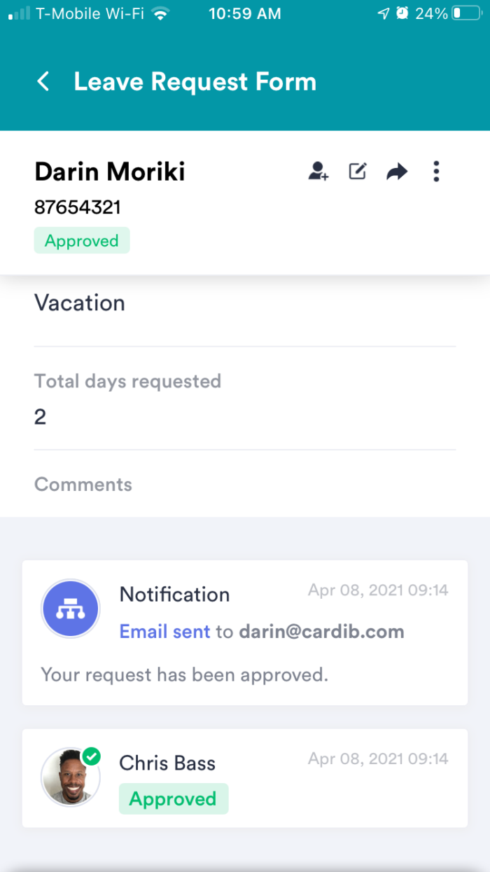 Wenn z.B. ein Urlaubsantrag genehmigt werden kann, aber noch Klärungsbedarf besteht oder die Daten angepasst werden müssen, können Sie auf den Genehmigungsantrag mit einem Ergebnis reagieren, das auf Ihre geschäftlichen Anforderungen zugeschnitten ist (und Ihren Genehmigungsablauf in Übereinstimmung mit Ihrem Ergebnis erstellen).