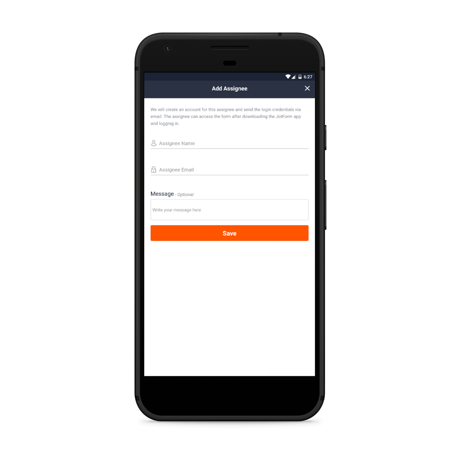 Wählen Sie ein beliebiges Formular in Ihrem Dashboard aus und weisen Sie es einer Person zu, indem Sie einfach deren Namen und E-Mail-Adresse eintippen. Wenn die Person noch kein Jotform-Konto hat, wird sie aufgefordert, die App herunterzuladen.