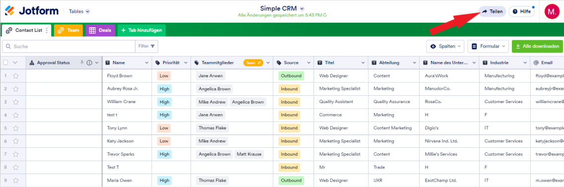 Da ein Jotform Tabellen Workspace und alle darin erstellten Registerkarten über einen Link oder eine benutzerdefinierte Einladung per E-Mail gemeinsam genutzt werden können, dauert es nur wenige Sekunden, bis jeder in Ihrem Team auf dem neuesten Stand ist.