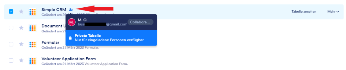 Auf der Seite Meine Tabellen können Sie nicht nur die von Ihnen erstellten Tabellen und/oder für Sie freigegebene Tabellen, verwalten, sondern auch auf einen Blick sehen, wer Zugriff auf Ihre Arbeitsbereiche hat.