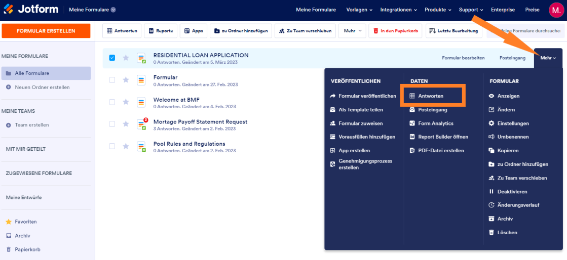 - Klicken Sie auf ein Formular in Ihrem Jotform Konto und wählen Sie im Optionsmenü, das oben in der Mitte der Seite Meine Formulare angezeigt wird, die Option Antworten.