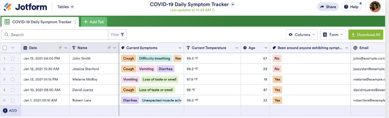 Jotform schließt diese Lücke, indem es Ihnen ermöglicht, einen nahtlosen Arbeitsablauf auf einer einzigen Plattform zu erstellen. Sobald Sie ein benutzerdefiniertes Onlineformular erstellt und freigegeben haben, können Sie alle eingereichten Antworten sofort in Jotform Tabellen anzeigen, organisieren, verwalten, analysieren und freigeben.