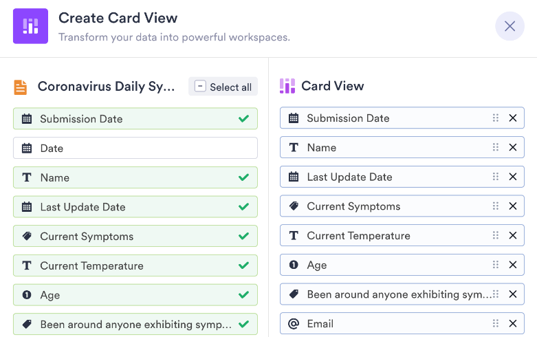 Wenn Daten aus einem Onlineformular mit einer neuen Kartenansicht in Ihrem Arbeitsbereich verlinkt sind, können Sie bestimmen, welche Antworten auf einzelne Fragen in einer Karte angezeigt und wie sie angeordnet werden sollen.