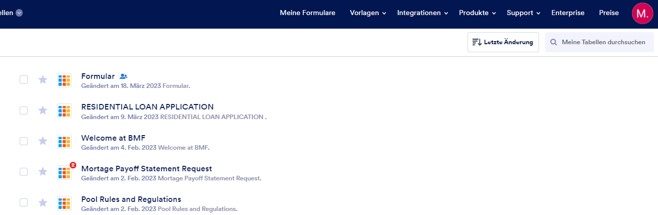 - Rufen Sie die Menüseite Meine Tabellen auf, indem Sie auf das Dropdown-Menü neben dem Symbol Meine Formulare klicken.